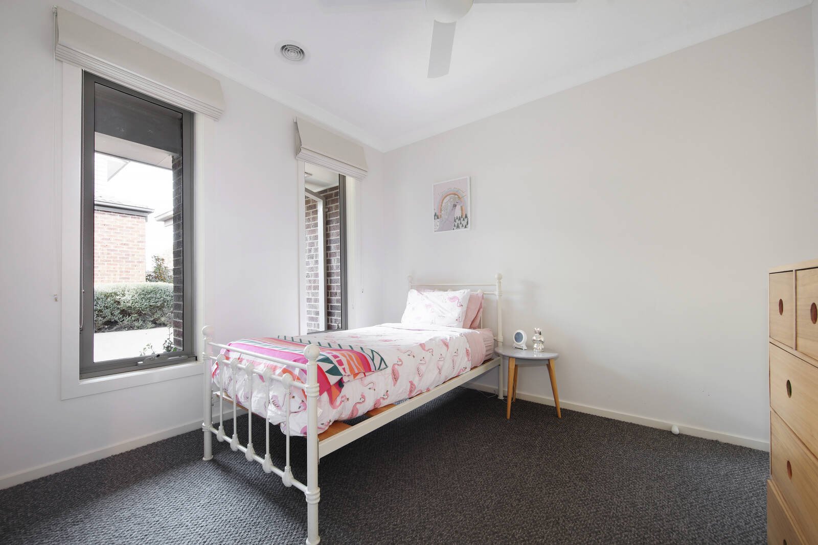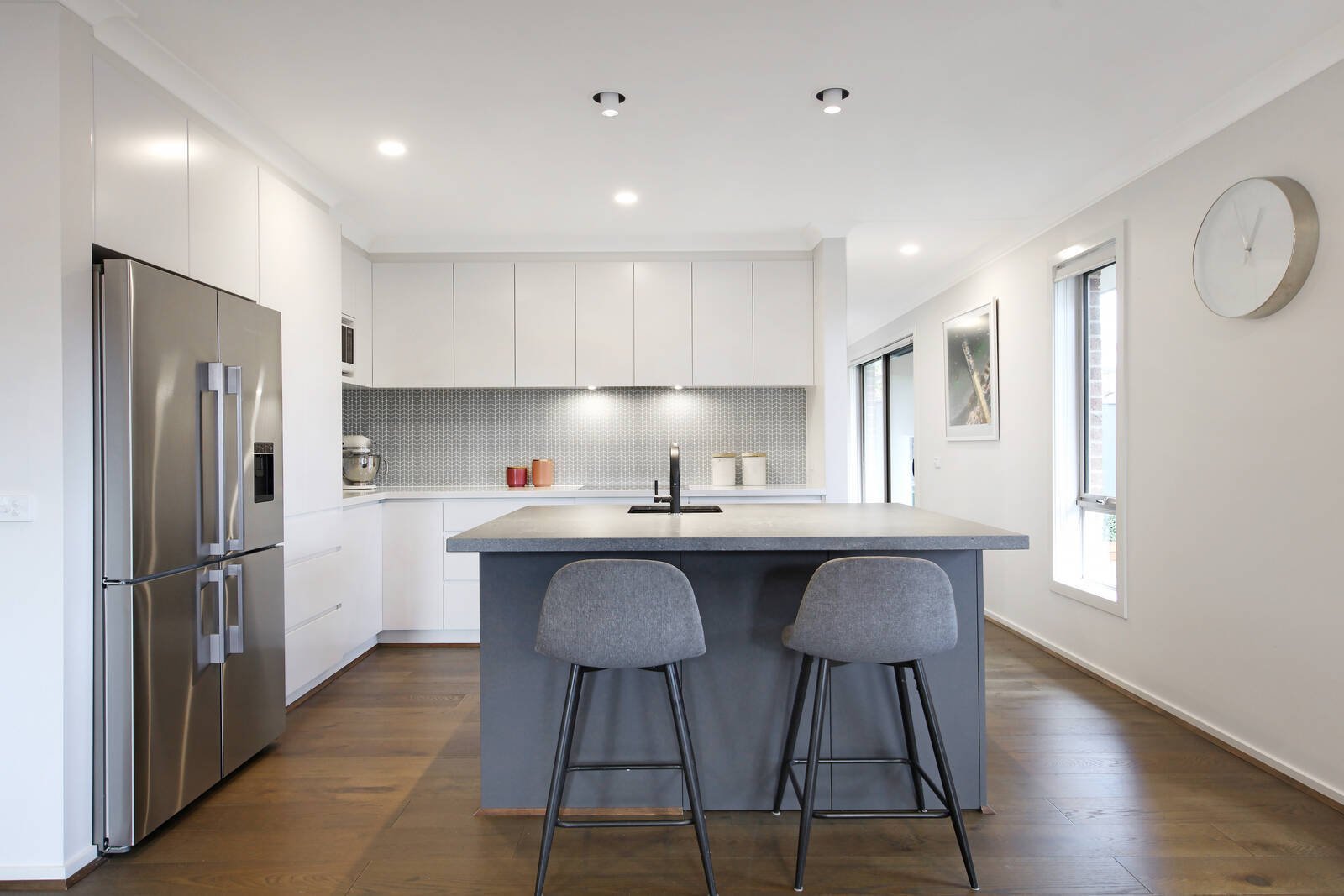 The main bedroom features a walk-in robe and chic ensuite, complemented by 2 additional robed bedrooms, sleek stone bathroom, spacious and beautifully light-filled home office (ideal to work from home), keypad entry, ducted heating, evaporative AC and single garage with storage.