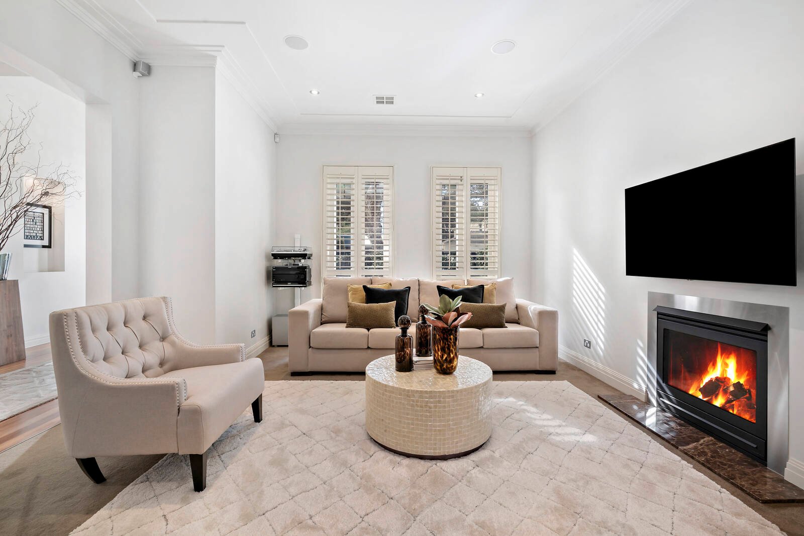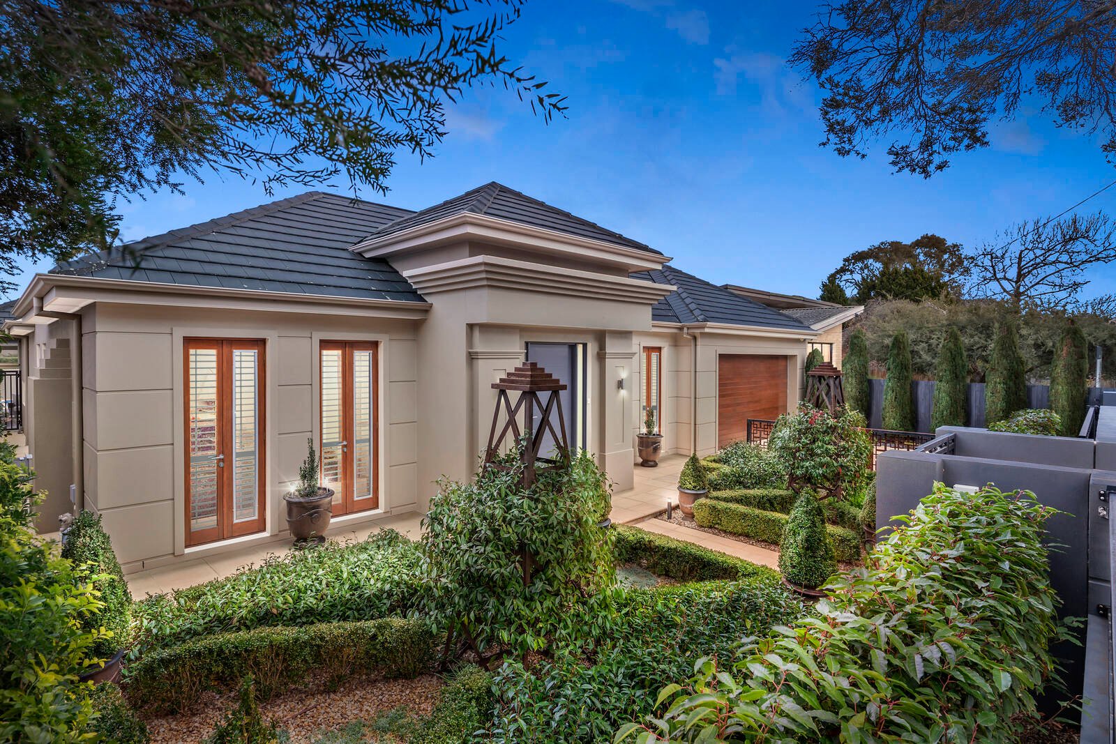 Introduced by glorious manicured gardens, the home’s stunning floorplan showcases high ceilings, fine appointments, bespoke cabinetry, and generously-proportioned sun-soaked dimensions.