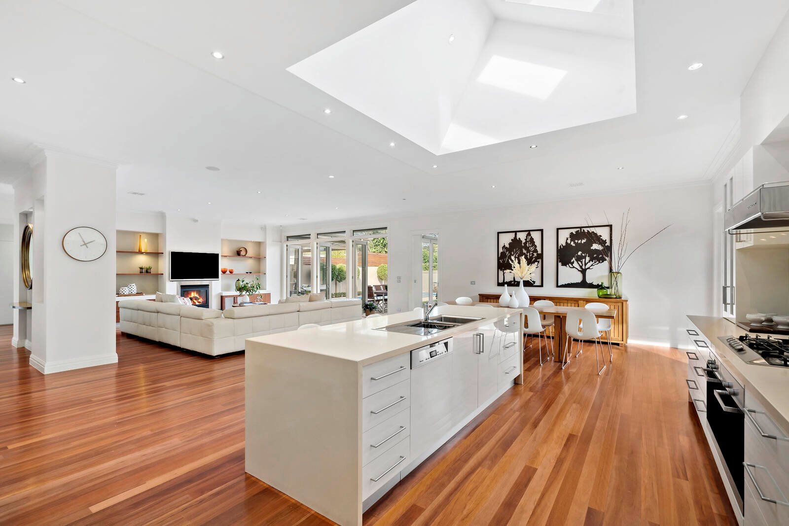 At the heart of the home, the vast living and dining zone with gas fireplace opens out through French doors to an alfresco terrace and covered outdoor entertaining zone; which overlooks exquisite gardens with a self-cleaning, solar/gas heated swimming pool, spa and water feature.
