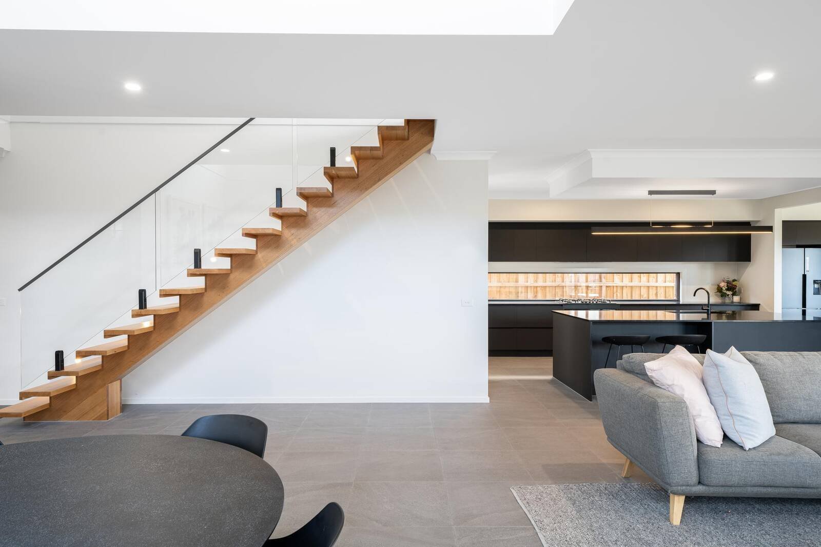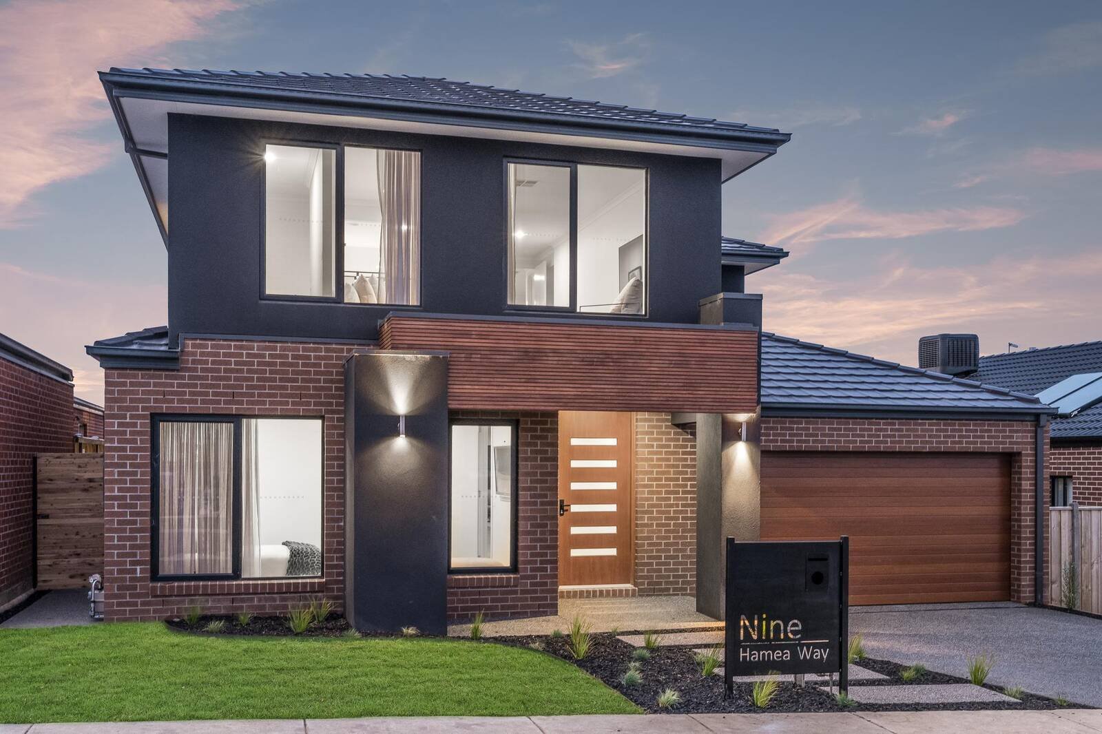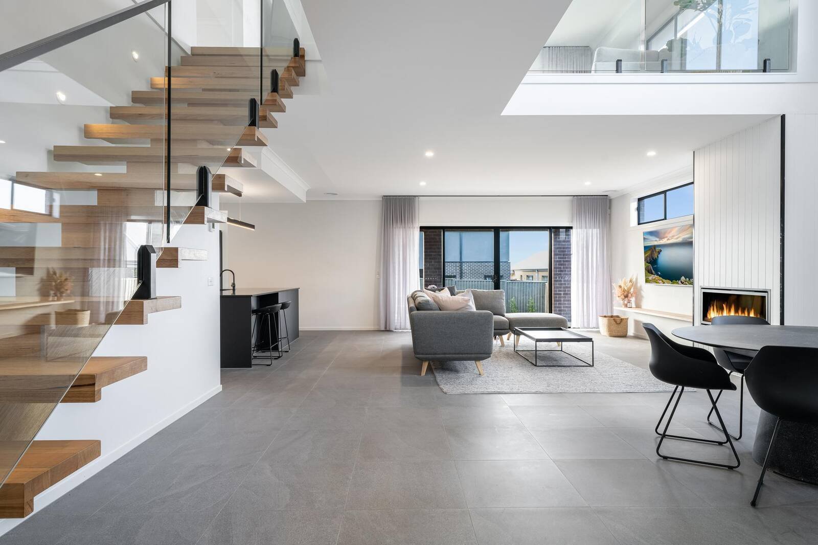 Black fittings, elegant sheer curtains and custom cabinetry throughout the home really showcases high-end classy living. The modern façade leads you to a magnificent wide entrance flowing through to an open plan family living/dining area, featuring a built-in gas fireplace & void. An abundance of natural light floods the open-plan and spacious interior including the kitchen, dining, and living area. Additionally downstairs there are 2 bedrooms with walk in robes, laundry