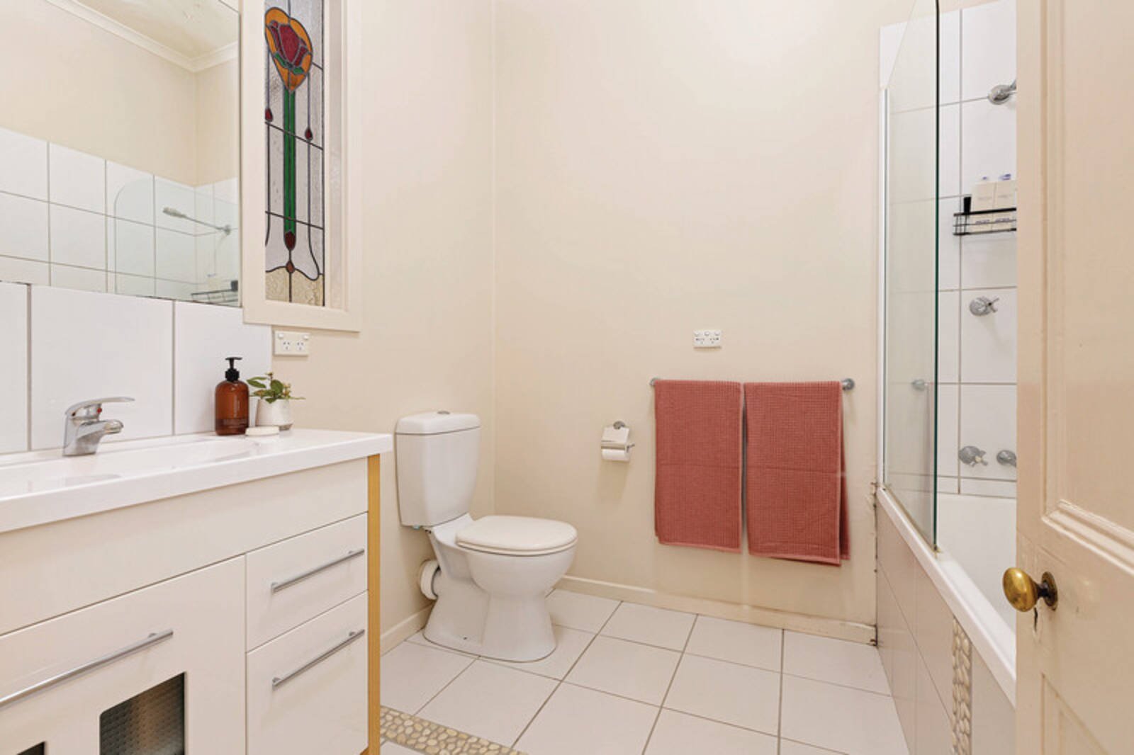 The family bathroom features a beautiful lead light window which complements the era of the home, whilst ducted heating and split system cooling in the meals area brings this period home into line with modern conveniences.