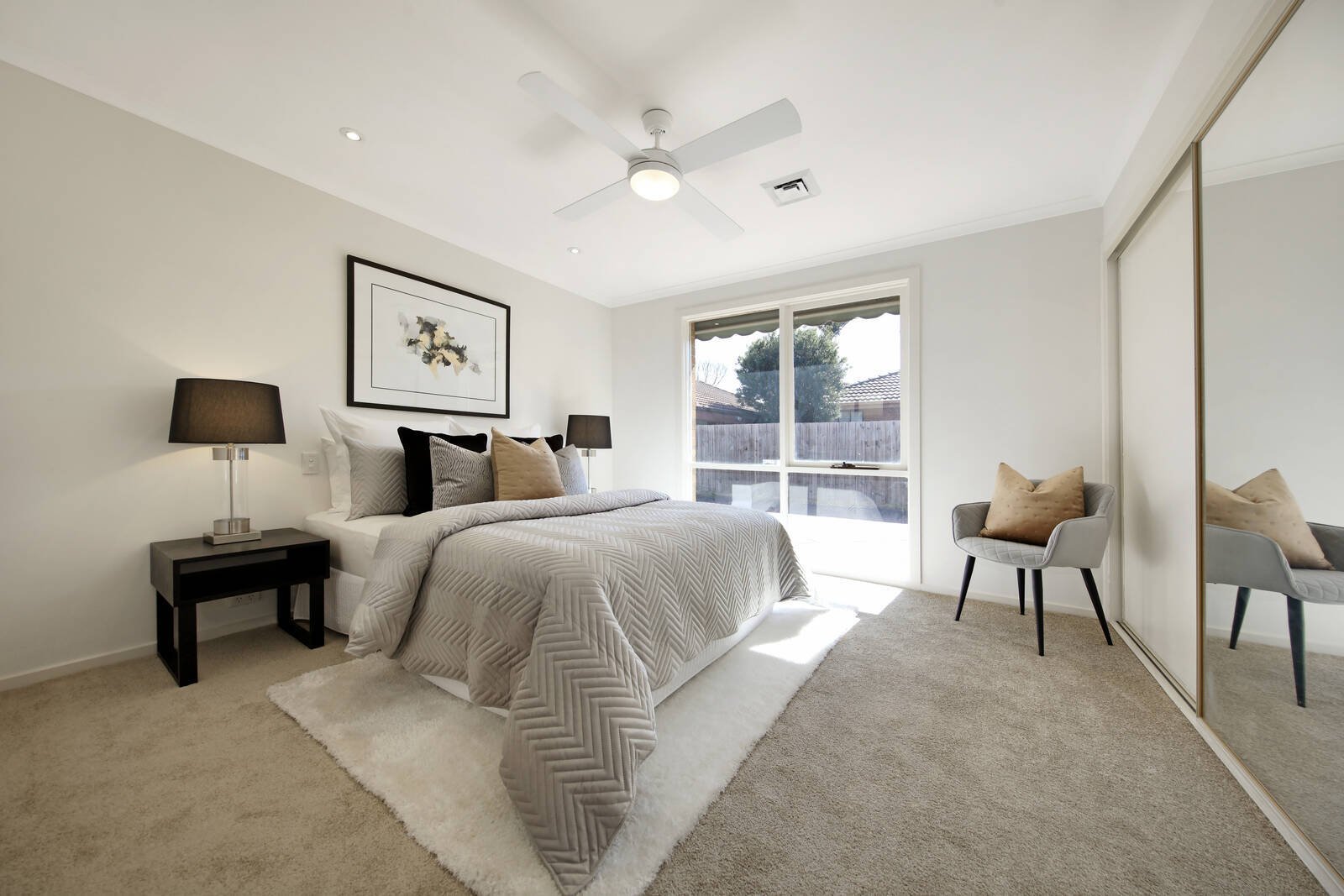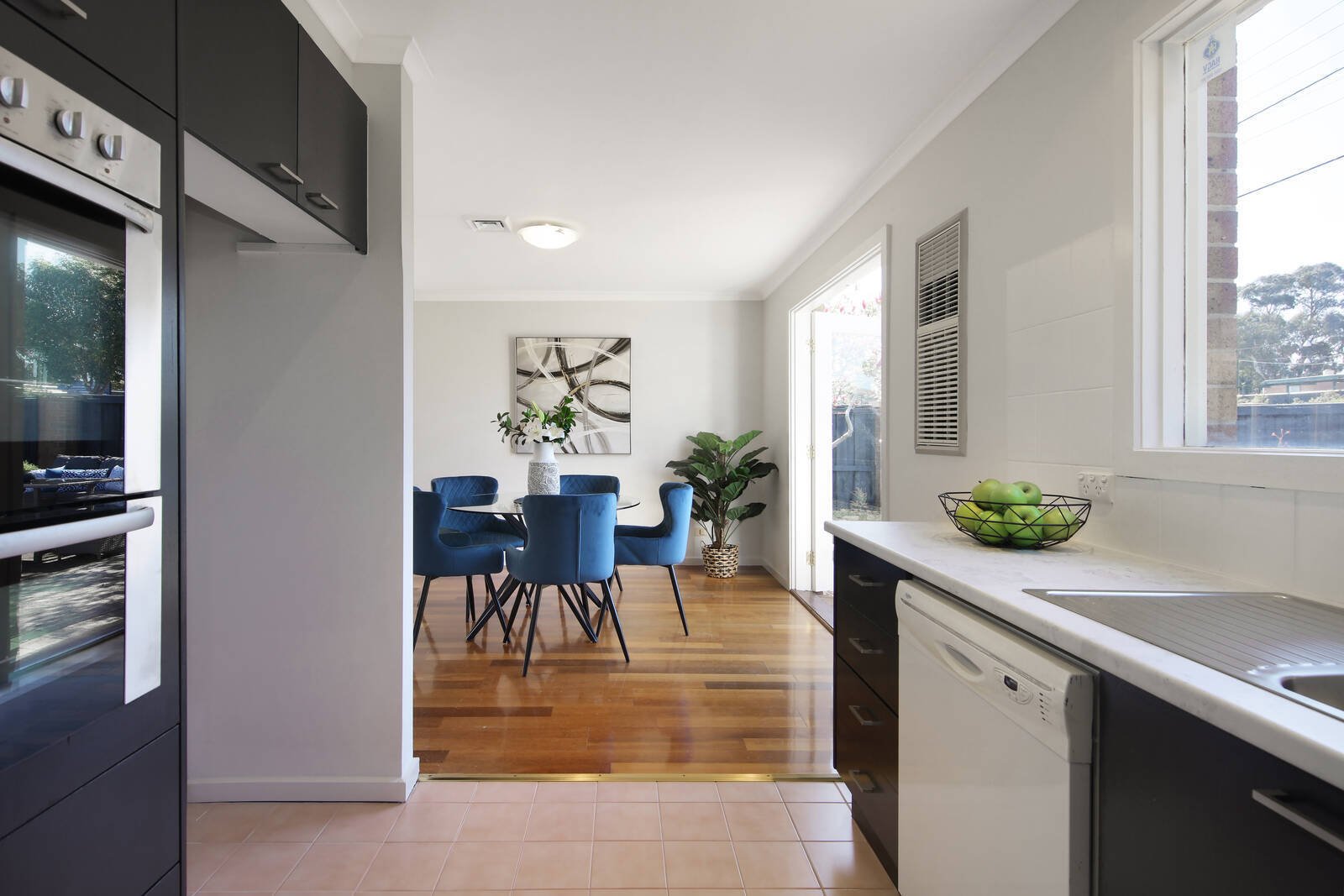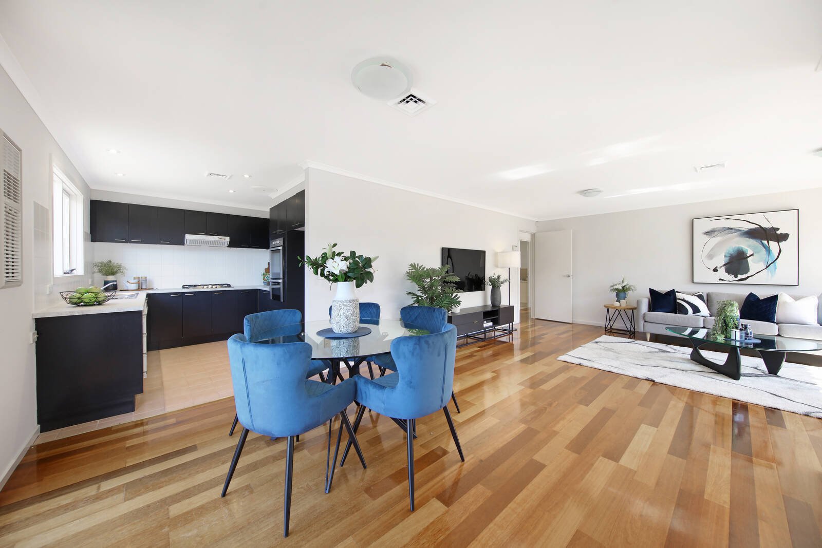 Northern sun, neutral tones and timber floors enhance free-flowing interiors, with living/dining merging with a chic kitchen boasting ample storage.