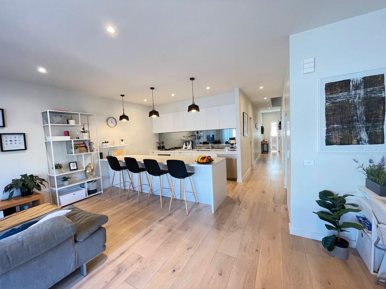 With lofty ceilings and wide-board timber floors, the open plan living and dining zone showcases the latest finishes with stone bench tops and mirror glass splash back elevating relaxed living that sets scene for alfresco catch-ups while the kids play on the low maintenance patio.
