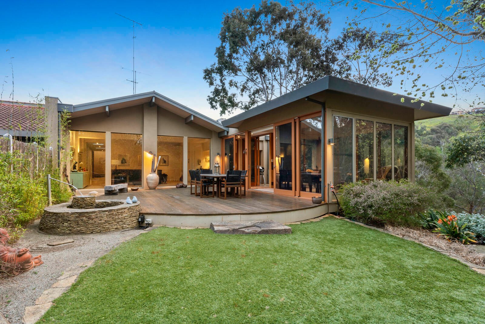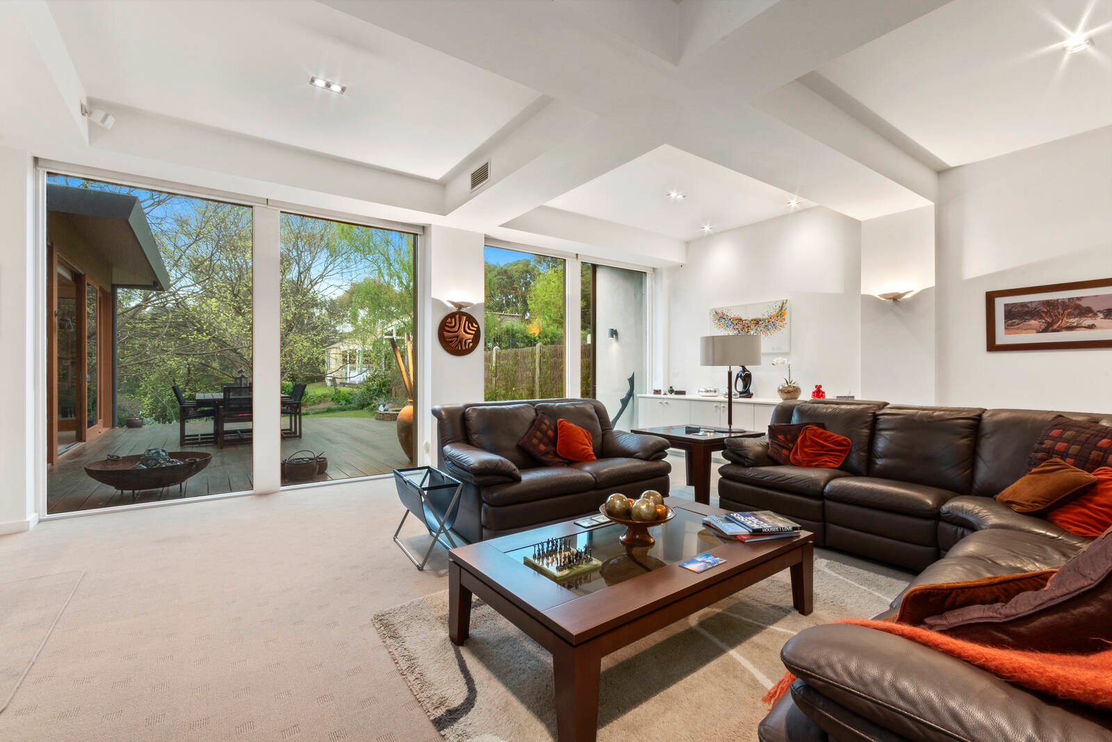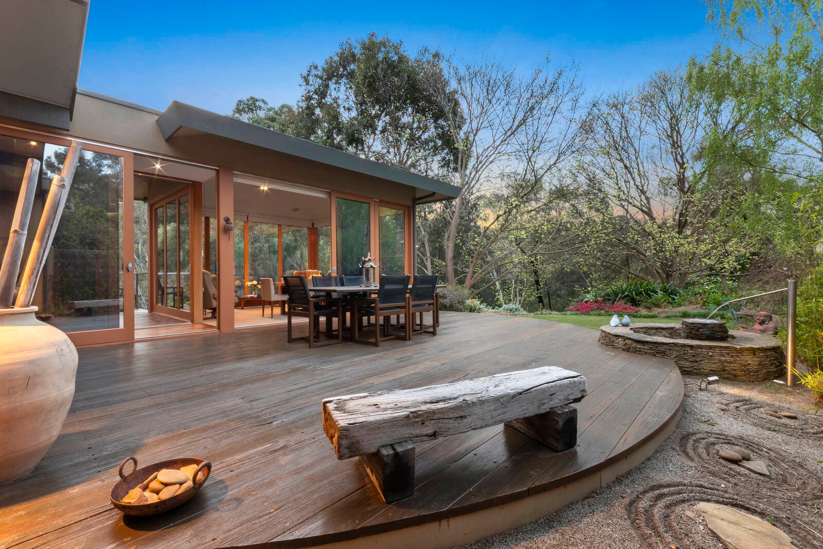 The heart of the home is created in the large living and kitchen zone which flows seamlessly through to the sunroom/dining area. It radiates an abundance of natural light and presents plenty of room for the whole family to enjoy. The living area has floor to ceiling windows looking on to a landscaped Japanese style garden and the sunroom/dining room has floor to ceiling windows on 4 sides and achieves the best of both worlds with river and garden views.