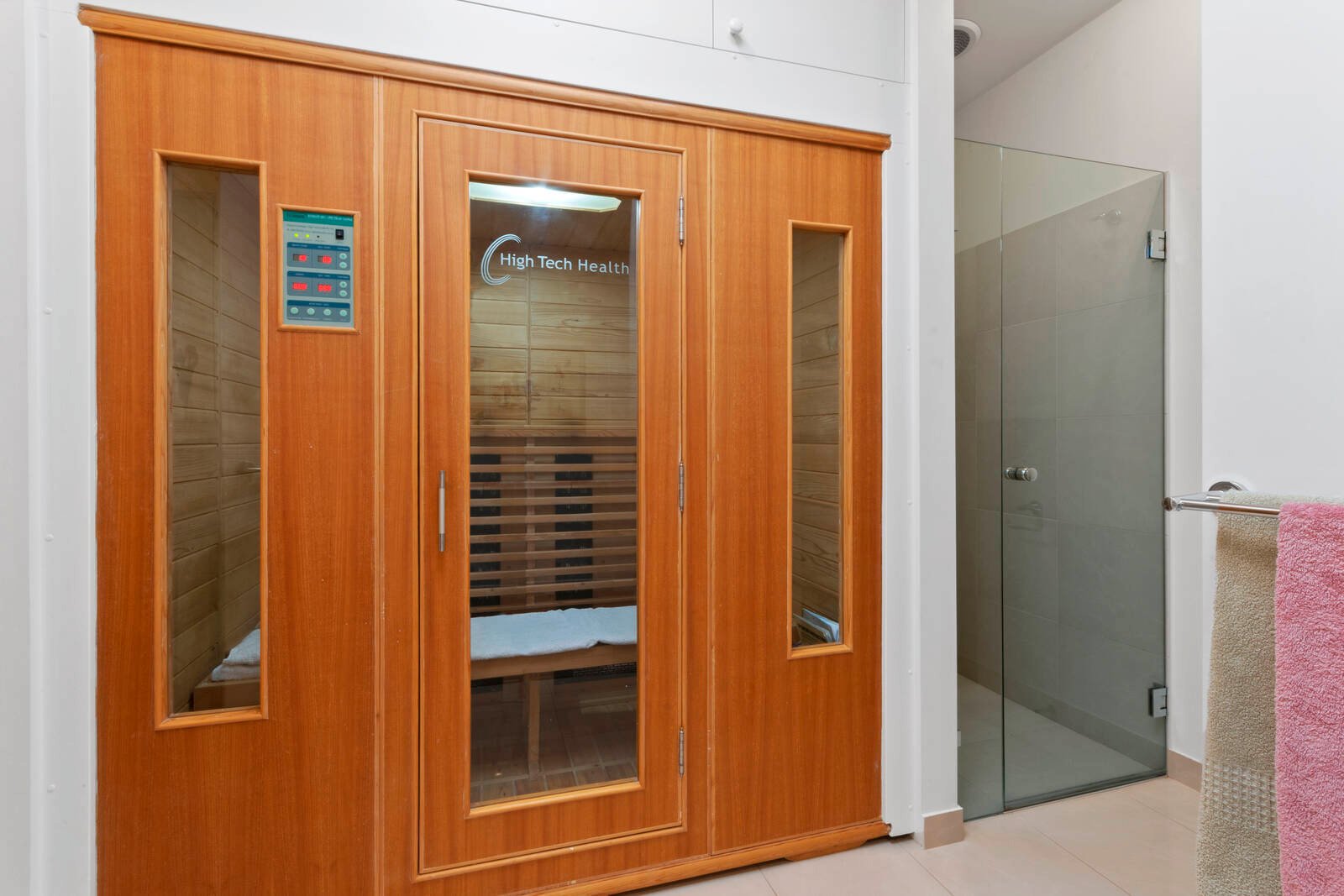 On offer is the master bedroom with stunning views, a large walk in robe and a marble tiled ensuite with slab floor heating, shower and toilet. Bedroom two offers a large wall of floor to ceiling cupboards and direct access to the main bathroom, although it could be considered as having its own ensuite. The stylish bathroom has tiled floor, separate shower, bath, toilet and impressive, built in infra - red sauna. Study/bedroom three is located at the front of the home and is currently being utilised as a study with built in desk.