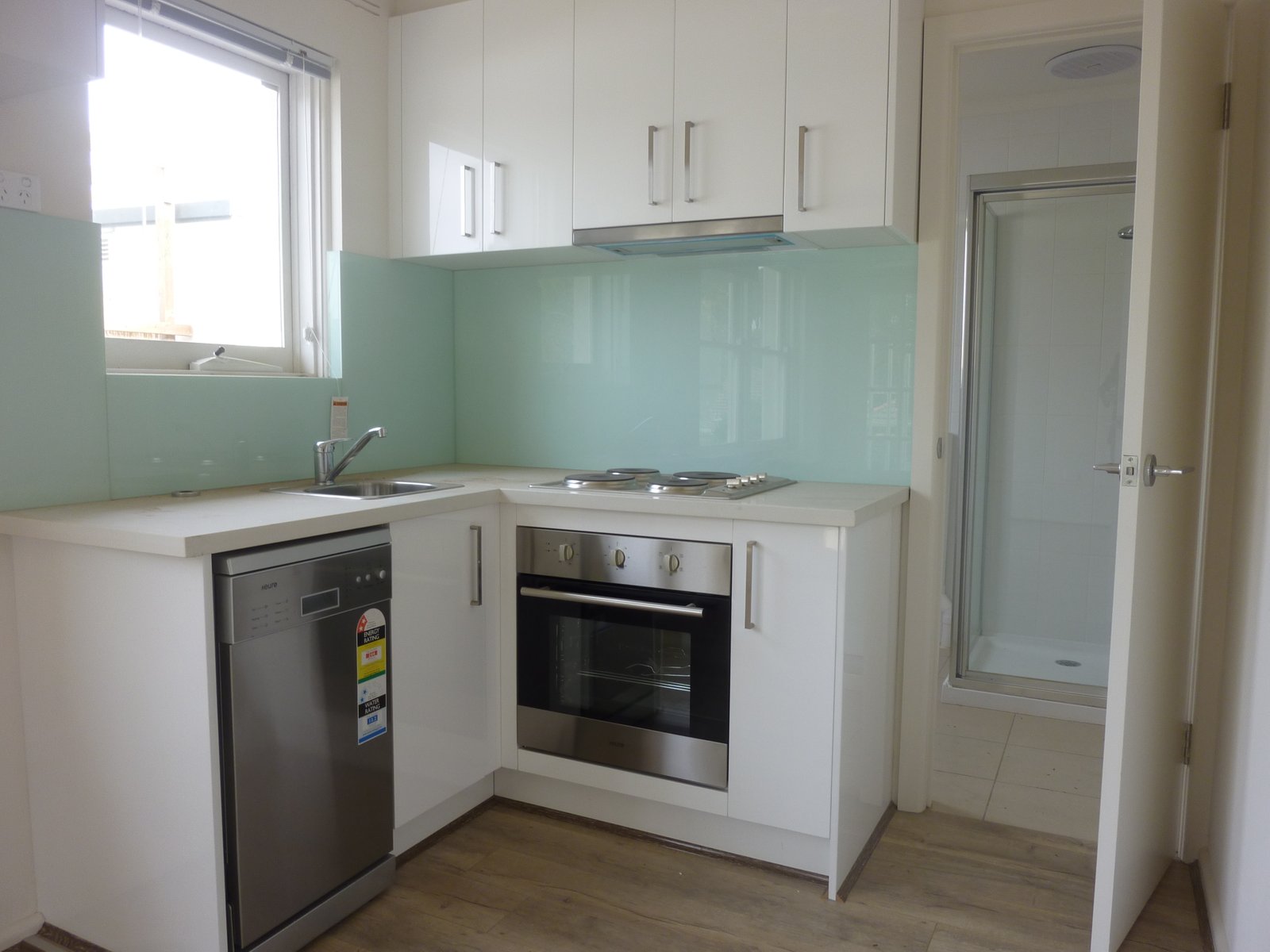 - kitchen with glass splash back, stone bench tops and stainless steel appliances including dishwasher