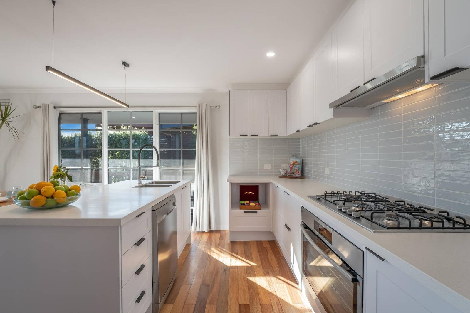 Perfect for those who love entertaining, the home features an open plan dining/kitchen which can spill out onto the deck overlooking the rolling hills of Fyansford. Stone bench tops, stainless steel appliances, and an island bench are featured.