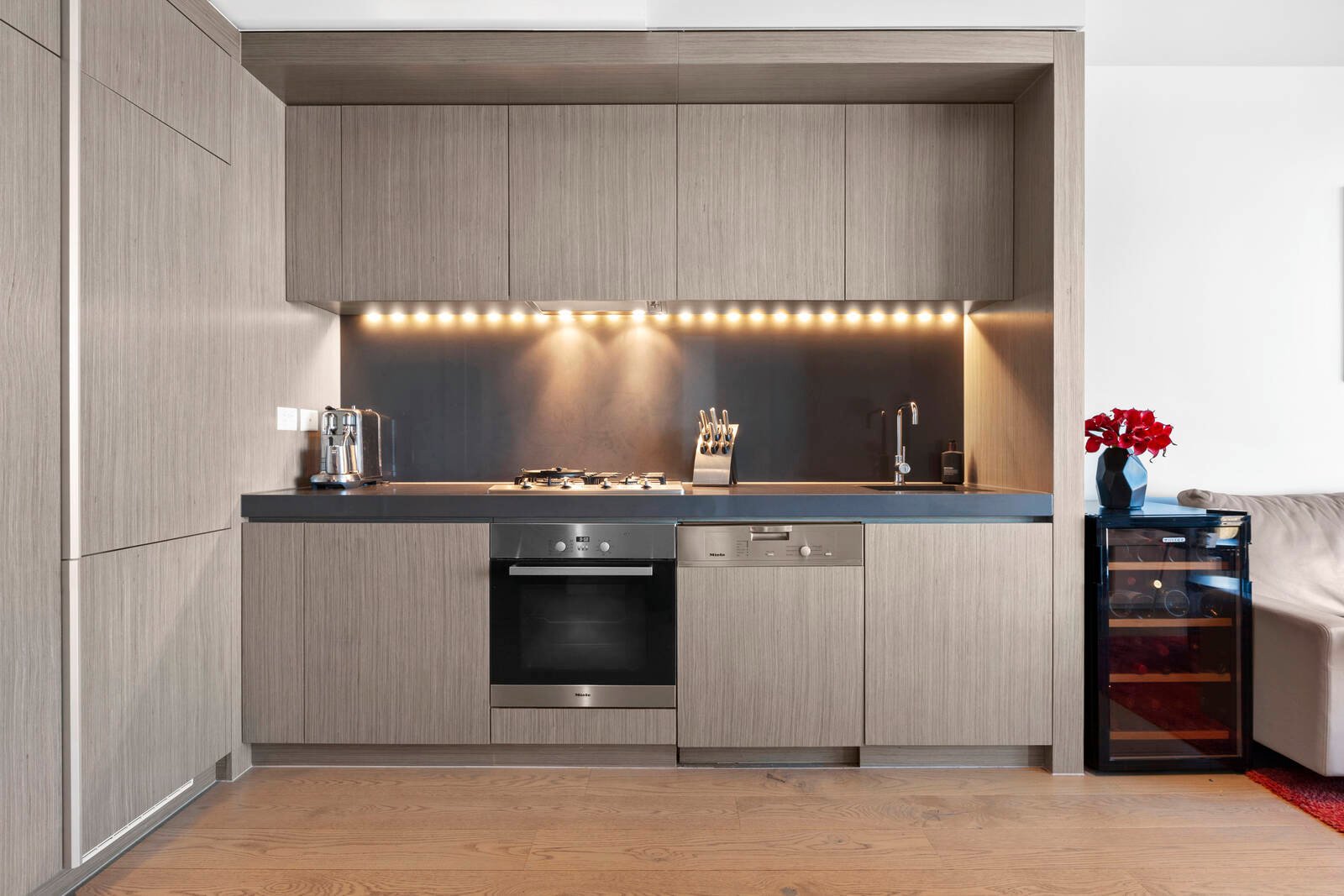 This contemporary one bedroom apartment’s elegant proportions are defined by high end finishes, abundant natural light and a private balcony from which to enjoy views of the bay and city skyline.