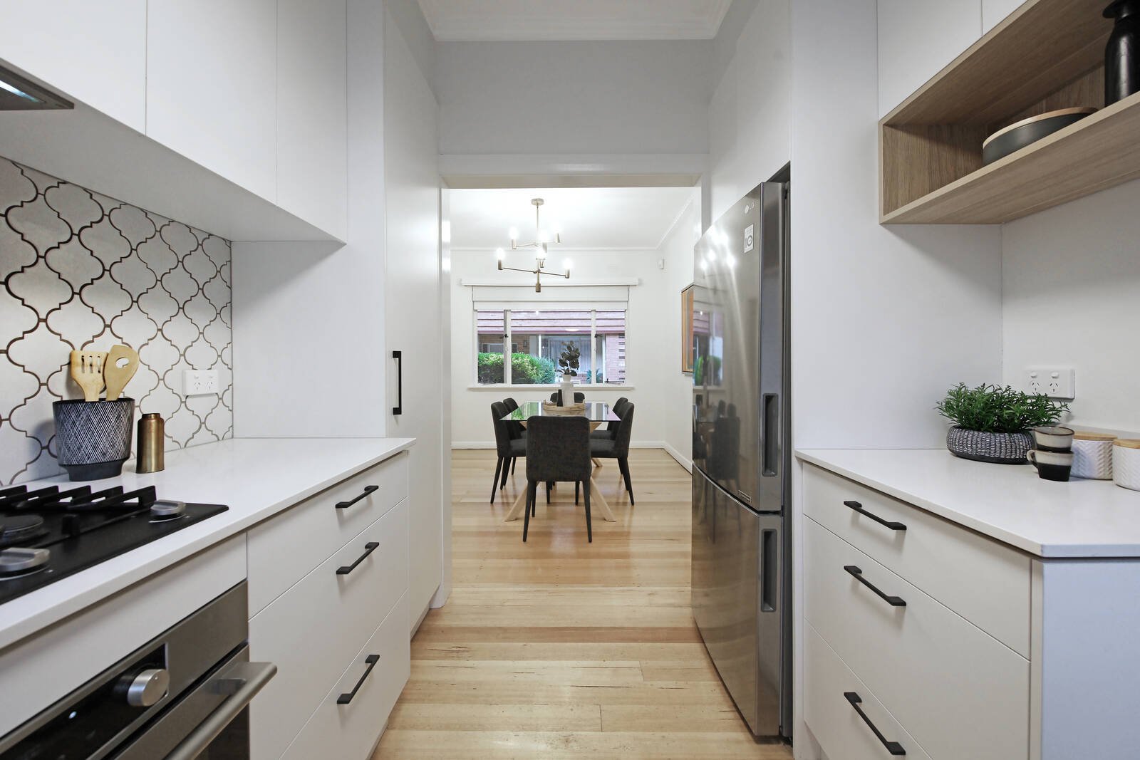 The huge main bedroom shares a pristine bathroom with an additional double bedroom, whilst an Escea gas heater, ample storage including cloak cupboard, single garage and large north-facing communal rear yard adds further lifestyle convenience.