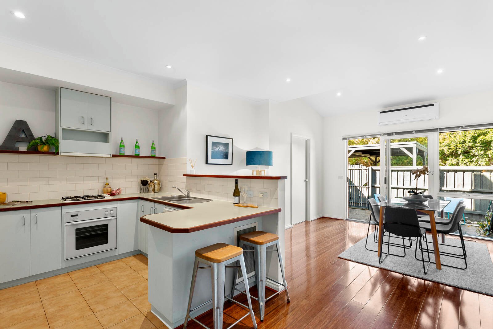 Superbly designed to maximise space with a clever study nook under the stairs, laundry with guest powder room and a sparkling two-way bathroom shared between two generous, upper level bedrooms each with built-in robes. Hardwood floors, picture windows, ducted heating and reverse cycle air conditioning ensure quality and comfort throughout with scope to put your own high-style stamp on neutral interiors.