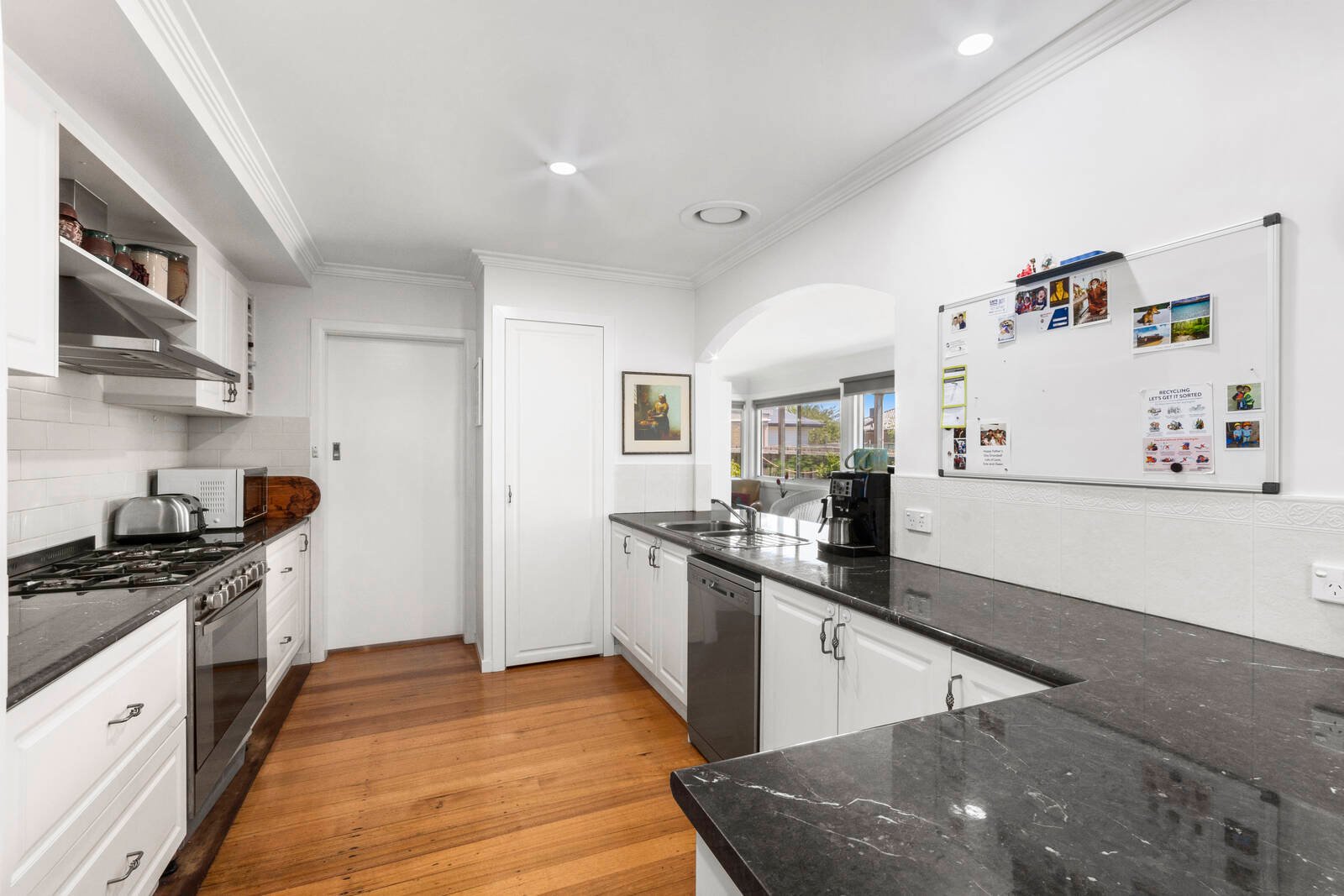 • Generous kitchen with 900mm 5 gas burner stove top and oven, dishwasher and classic white subway tile backsplash.