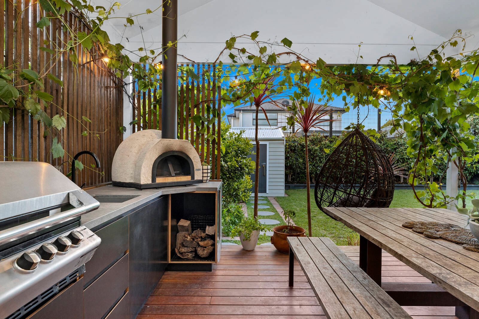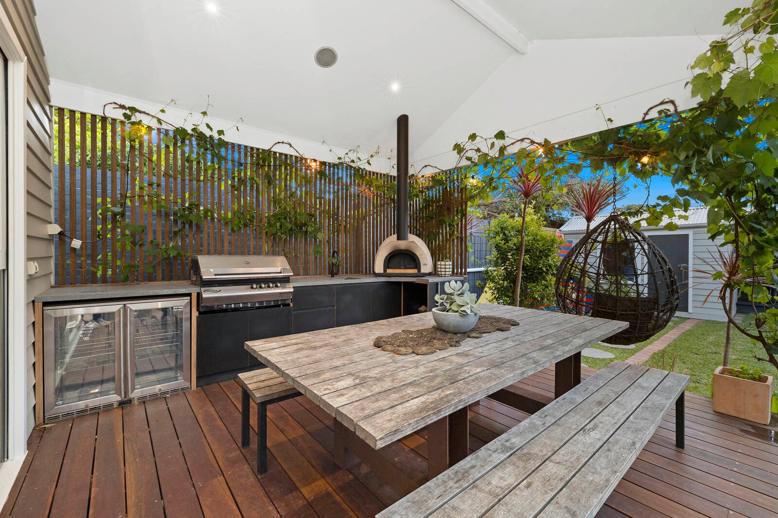 During Summer months, simply open the huge sliding doors leading out to a stylish alfresco area. Here you find a built in BBQ, bar fridge, plus wood fire pizza oven. You will love the large landscaped garden and cubby house.