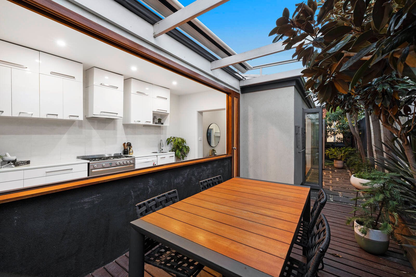 Expansive glazing ensures stylish interiors enjoy bright natural light whilst bifold windows and doors allow a generous living/dining and kitchen direct access to a perfectly private landscaped courtyard and undercover deck with retractable shade designed for any weather entertaining.