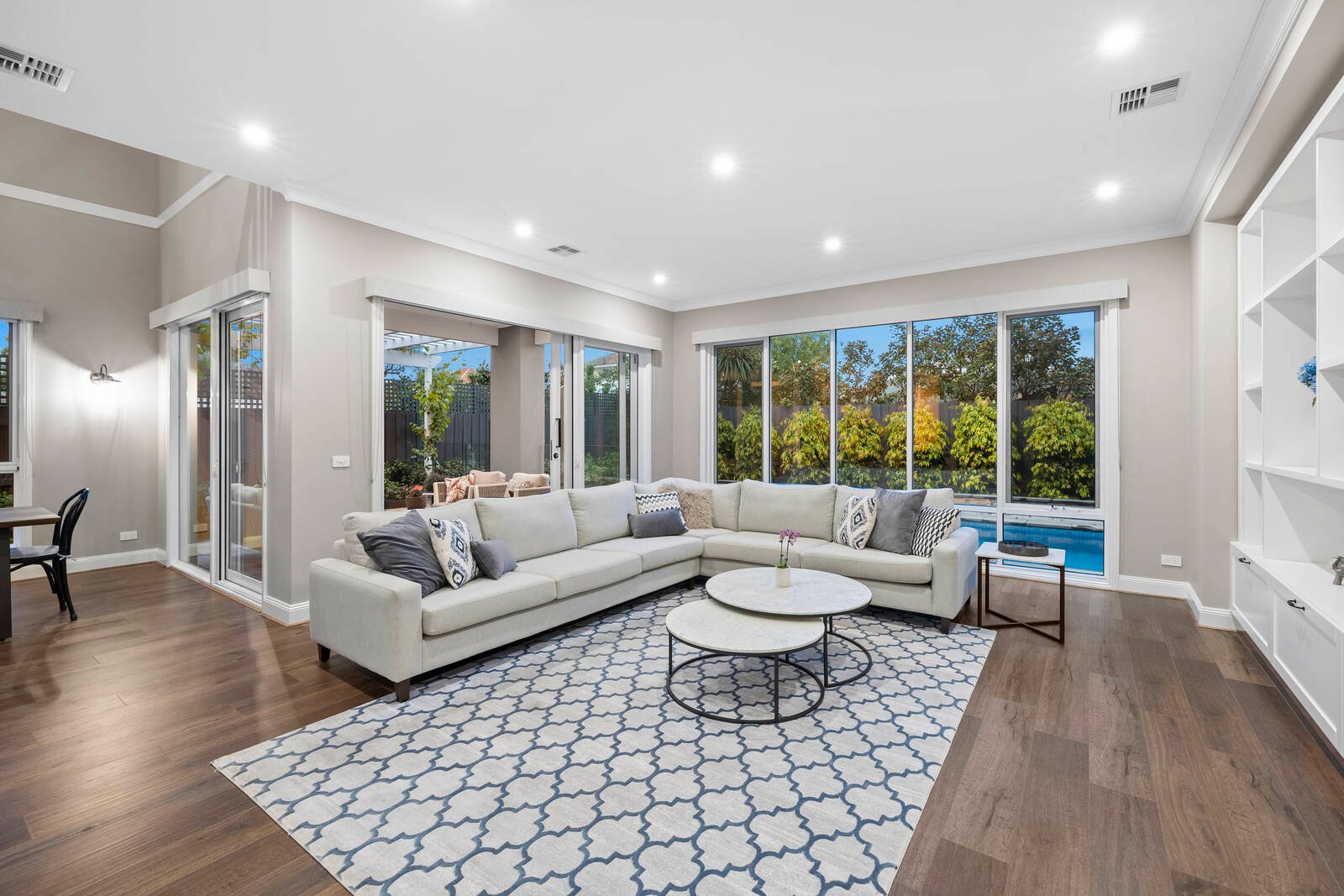 Constructed to a unique standard with lofty 3m ground-floor ceilings (and 2.7m above), and second-storey concrete floors for noise -control, the home is endlessly energy efficient with 29 solar panels, solar hot-water and extensive double-glazing, dimmable LED lighting, designer pendant lighting and USB points. Even the flyscreens are well-considered with sleek slide-away screens.
