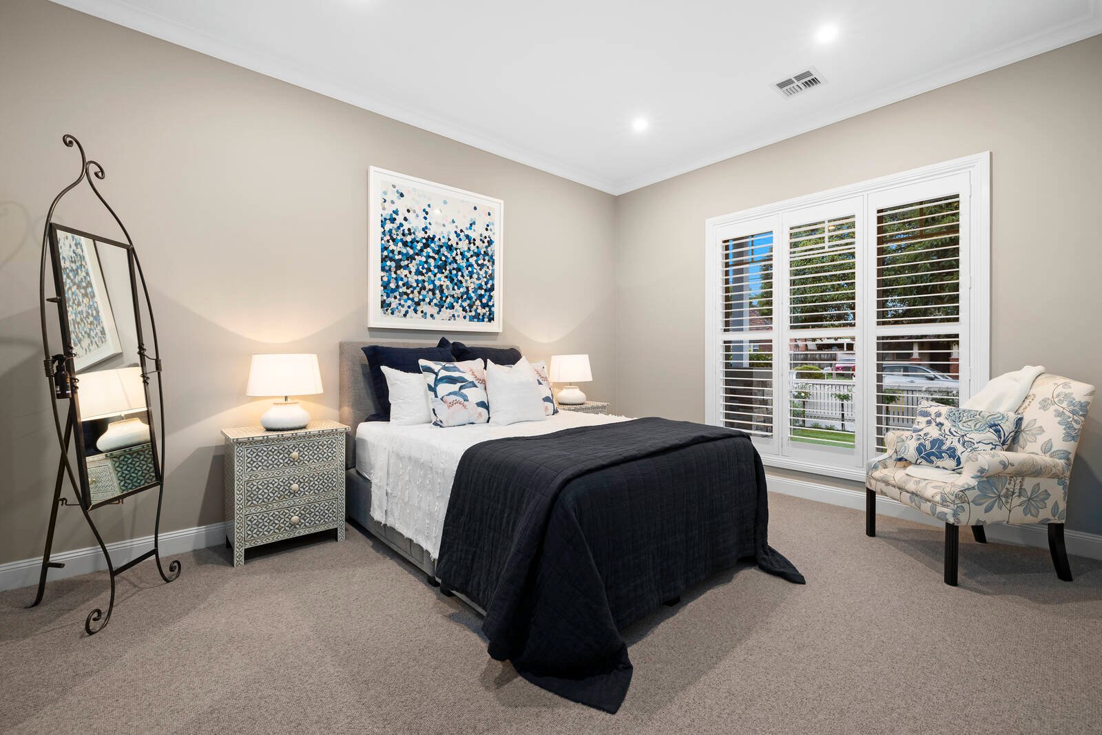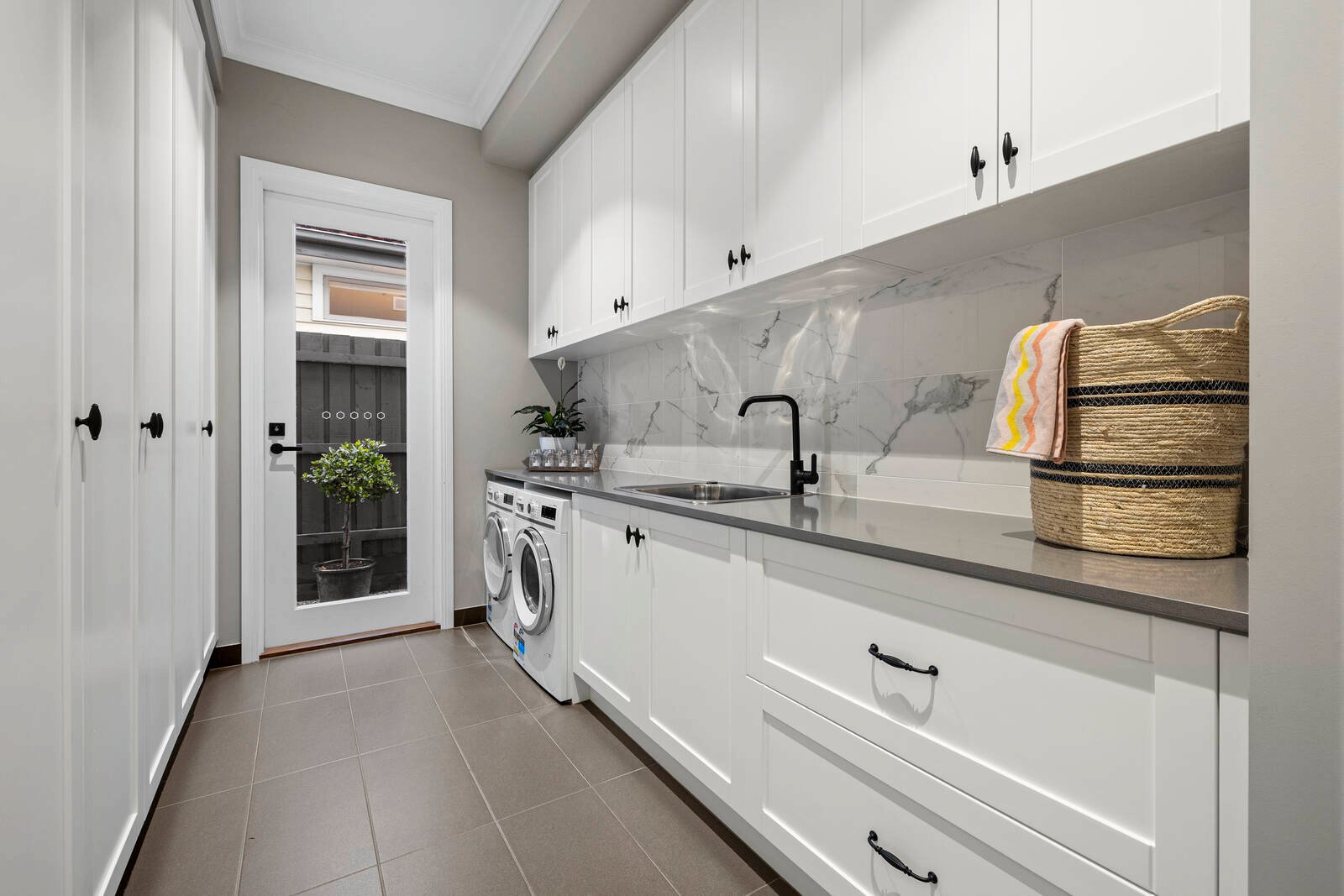 Appointed to a demanding specification with Australian-designed InAlto appliances (including dual ovens) taking the spotlight in the refined Hamptons kitchen and a beautifully fitted butler’s pantry backstage, this expansive entertainer showcases top-class finishes. There are subtly-hued stone benchtops on lustrous 2-Pack cabinetry, wideboard floors plus plush carpets, a tailored mix of matte-black (for parents) and chrome tapware (for the kids), and elegant plantation-shutters alongside softly pelmetted linen blinds (automated where necessary).