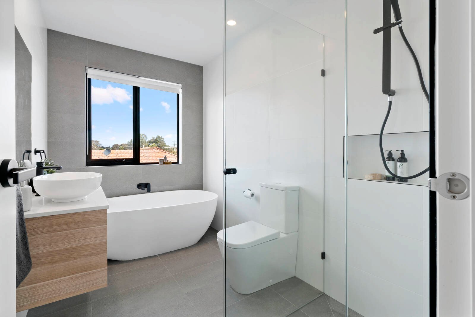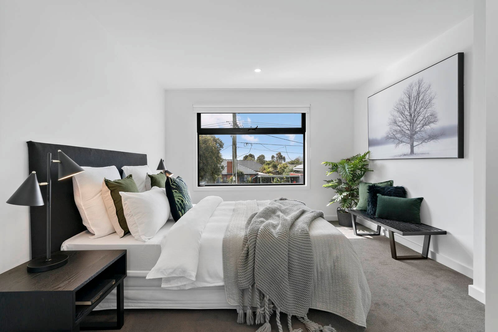 Both master-bedrooms showcase large WIR, stunning ensuites and are both generous in proportions. Two further bedrooms both with BIR are serviced by a luxurious family bathroom including free-standing egg-shaped bathtub and on trend matte black tapware.