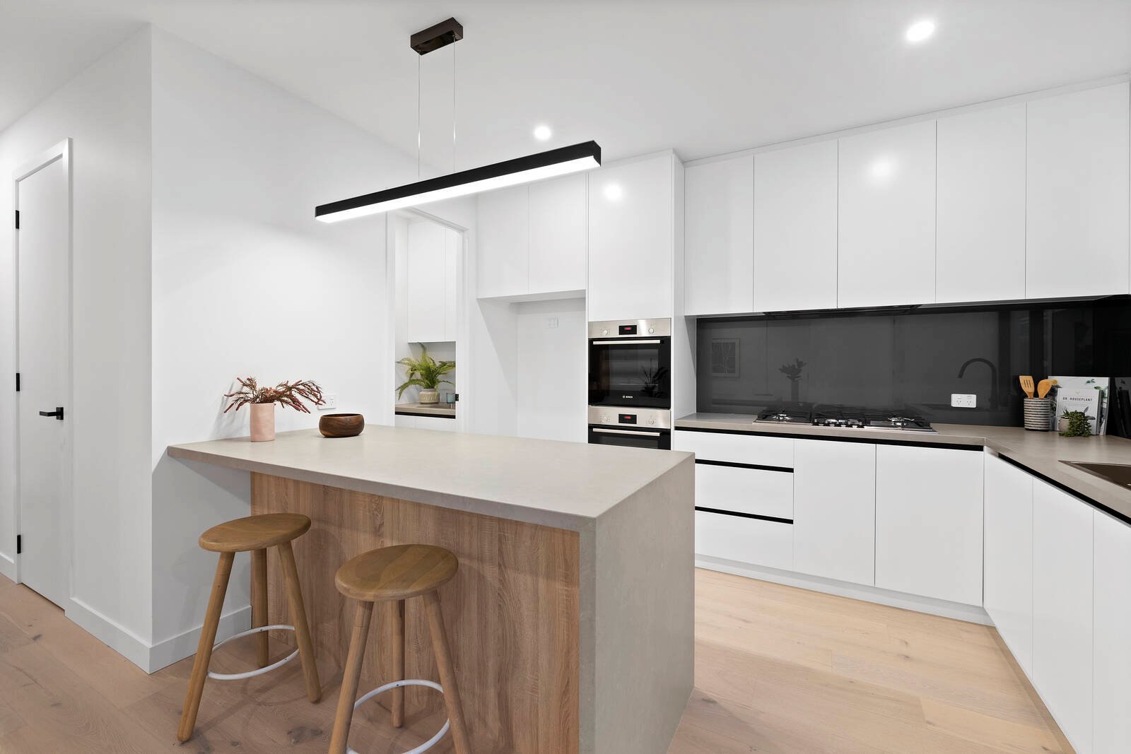 Soft neutral tones and sensational natural light combine to create a welcoming atmosphere throughout open-plan living/dining and deluxe kitchen flaunting stone surfaces, breakfast bench and quality appliances.