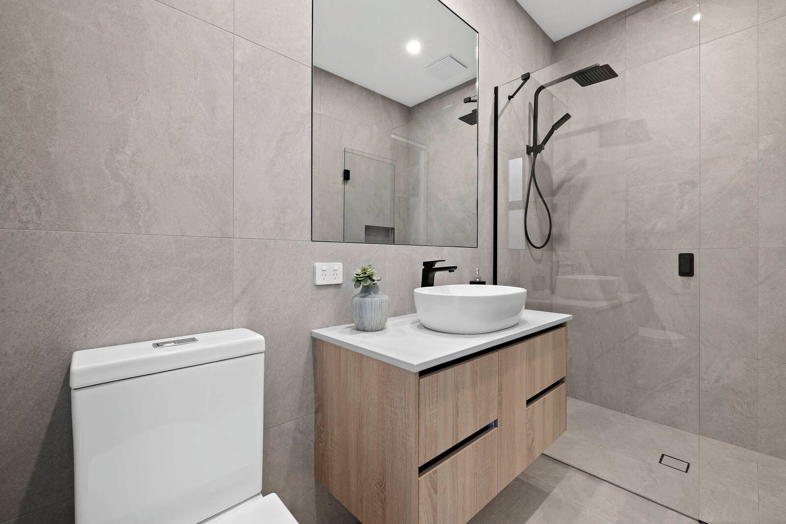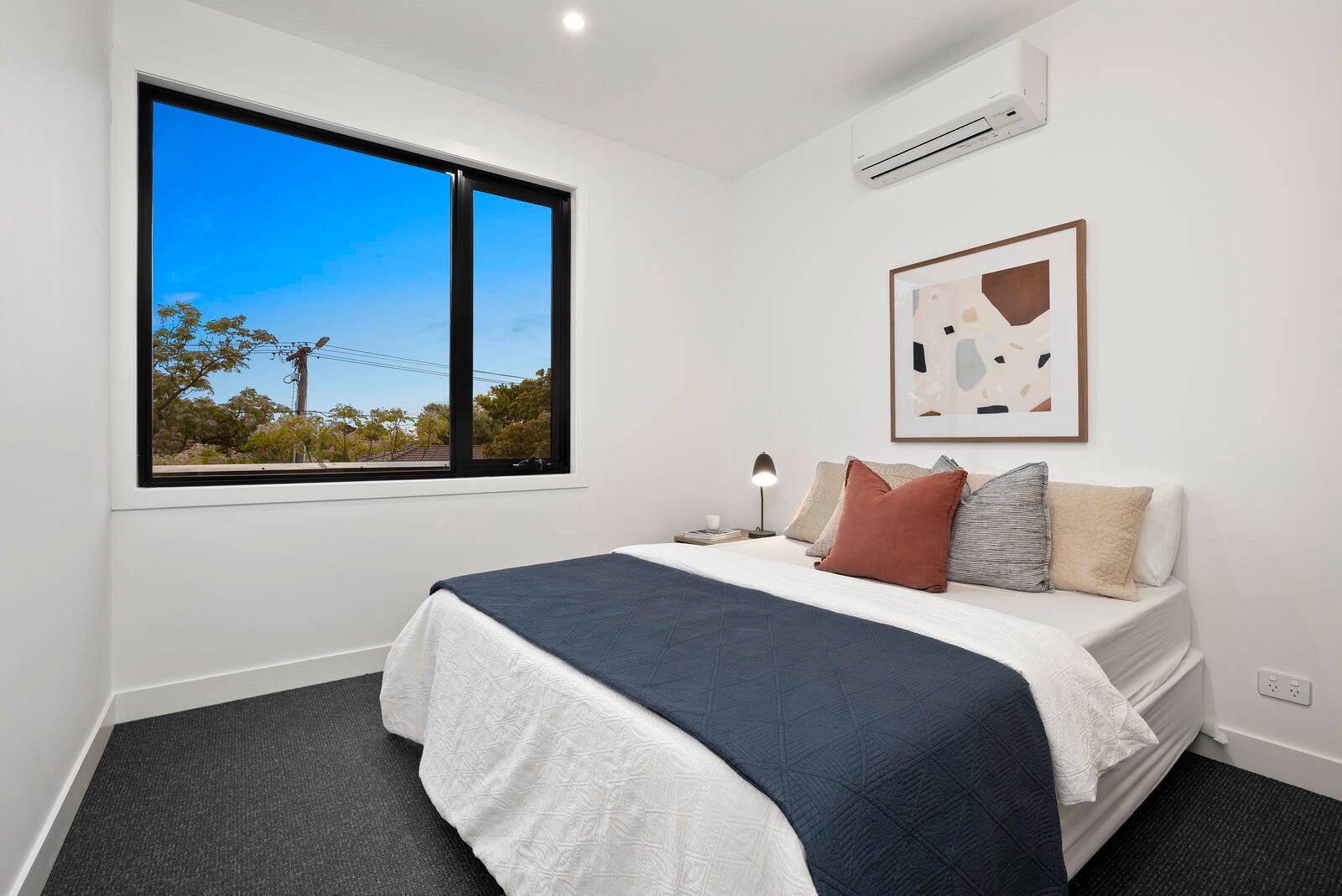 The upper-level is a dedicated sleeping zone, including a sumptuous master suite with WIR and chic ensuite plus a sleek fully-tiled bathroom finished with designer matte black tapware.