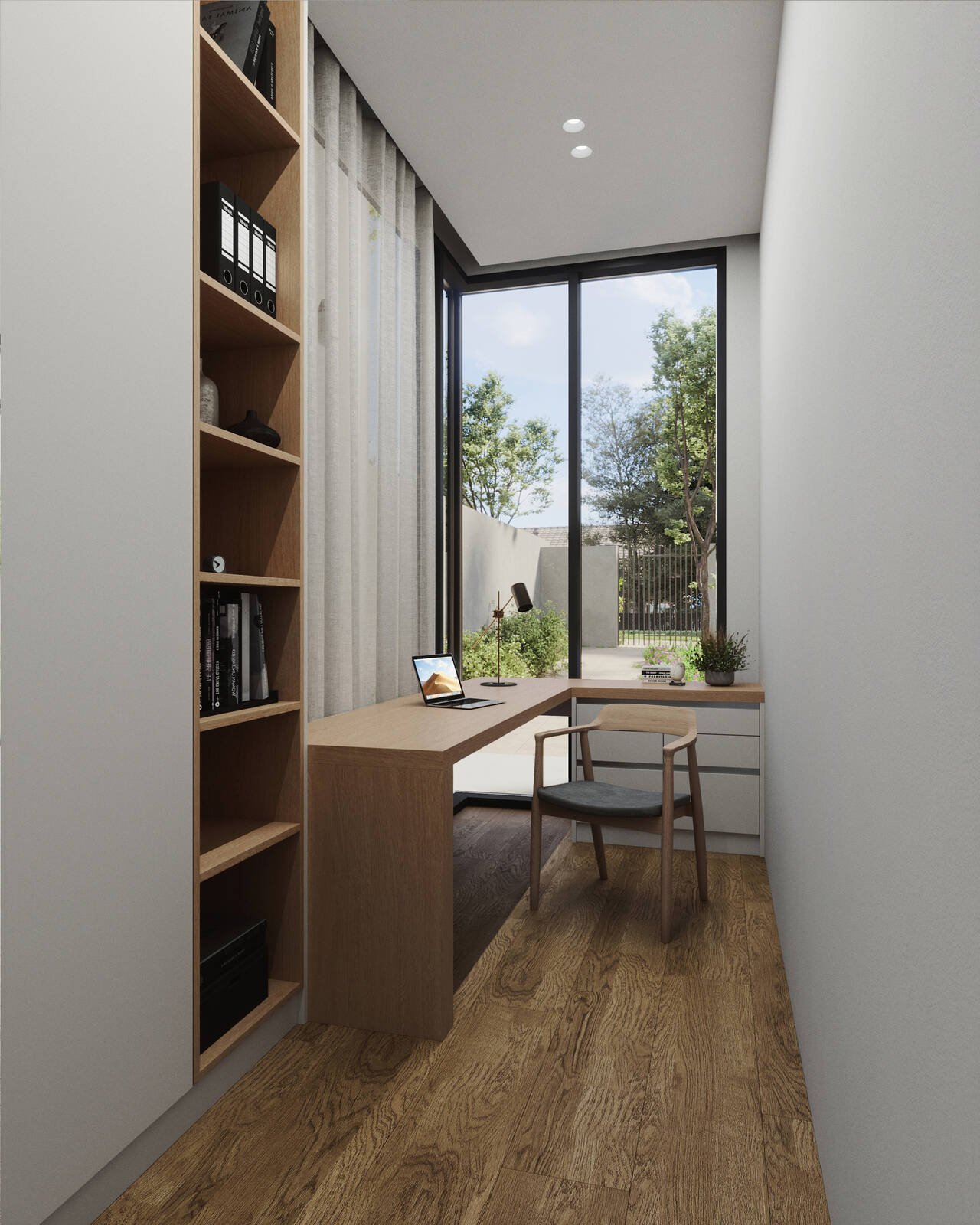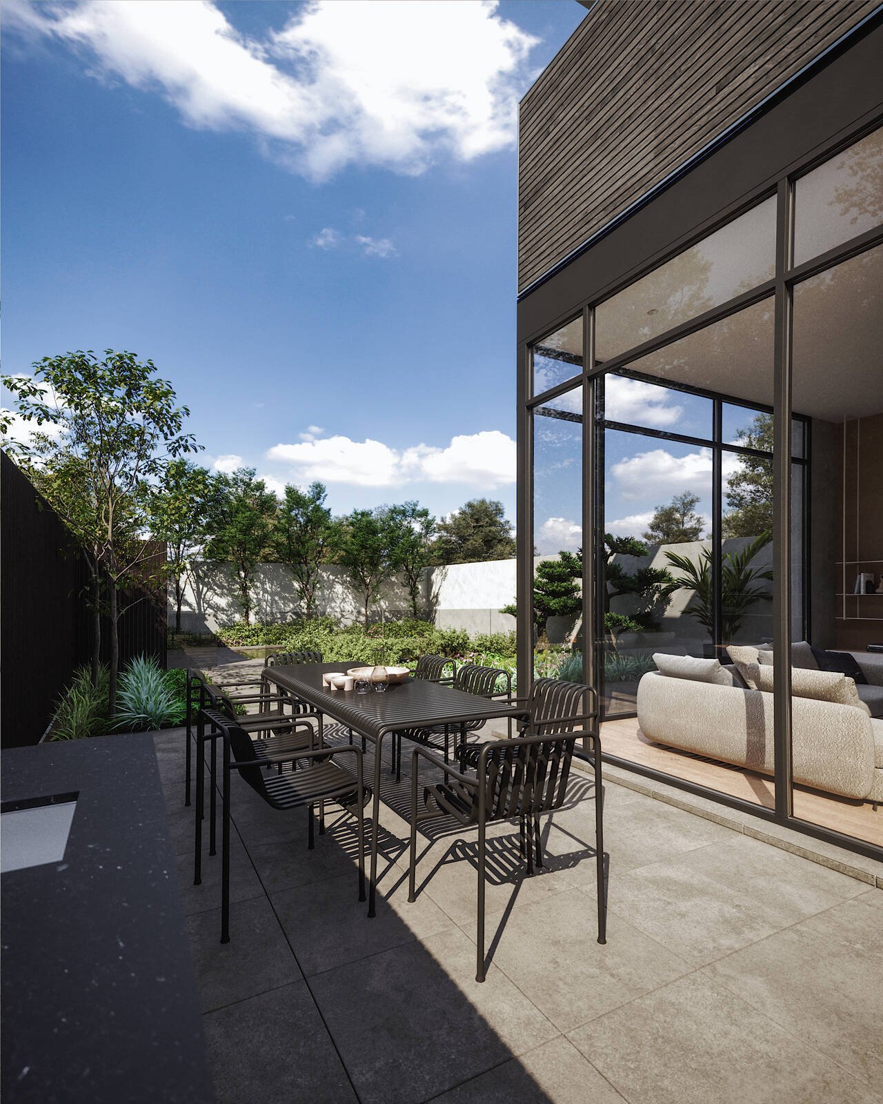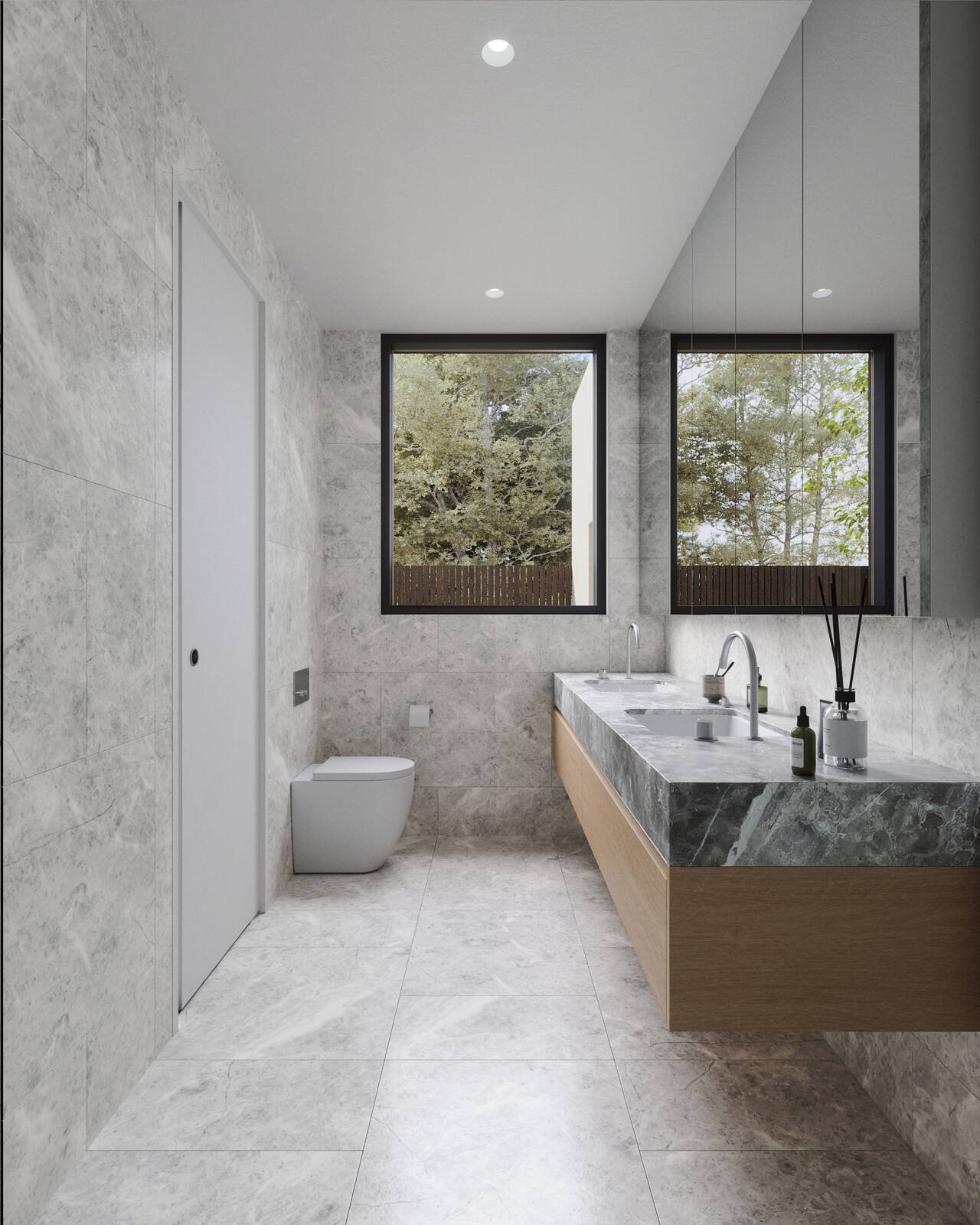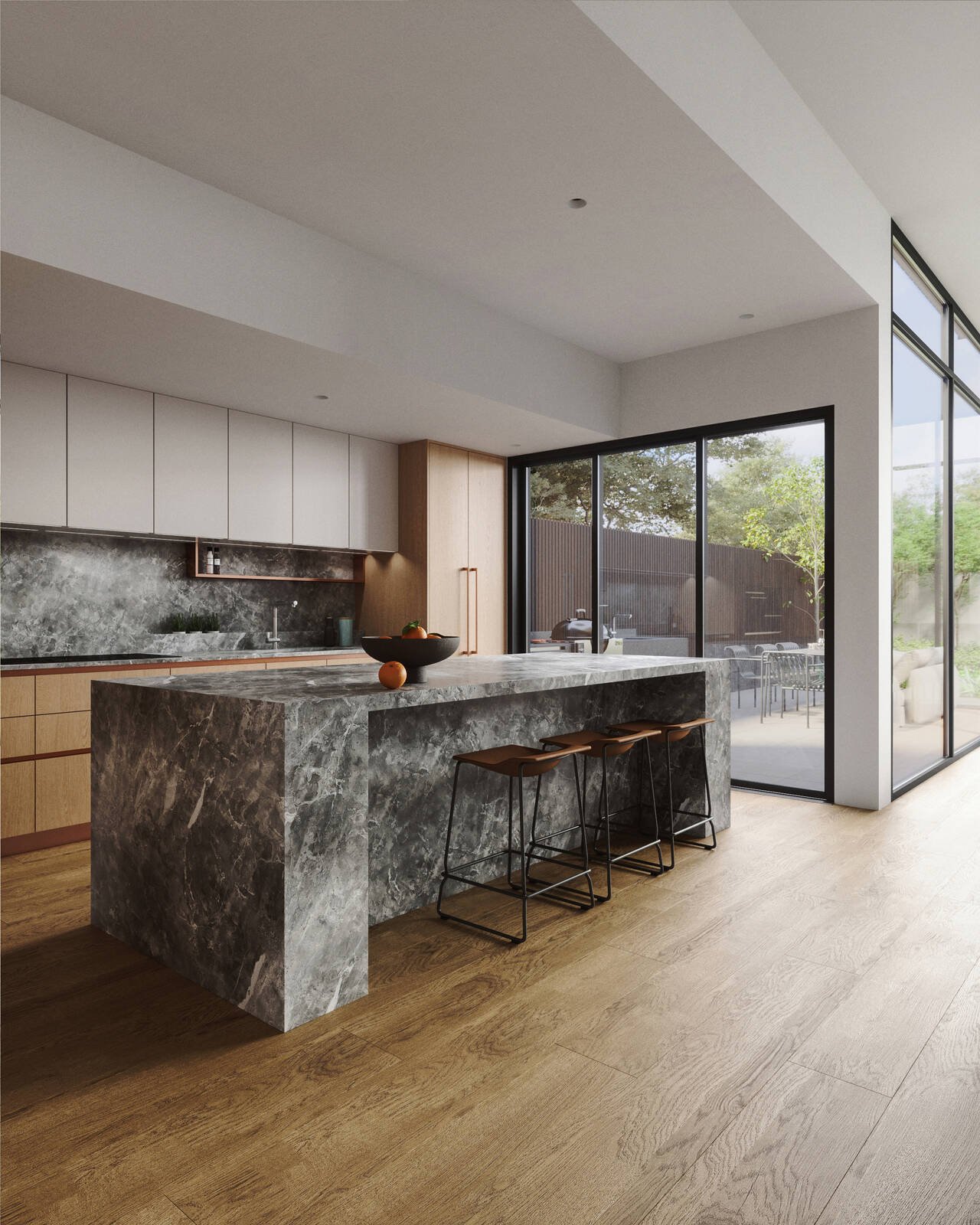 With bathrooms and kitchen wrapped in luxurious Grey Tundra marble, and premium timber, tile and carpet choices, the home is a showcase of today’s most outstanding architectural detail with ground-floor ceilings rising to 3m, sleek P50 architraves and custom joinery including an eye-catching feature fireplace. The well-positioned home-office offers minimalist luxe with a fitted workstation and library shelving in a sunlit garden-view space.
