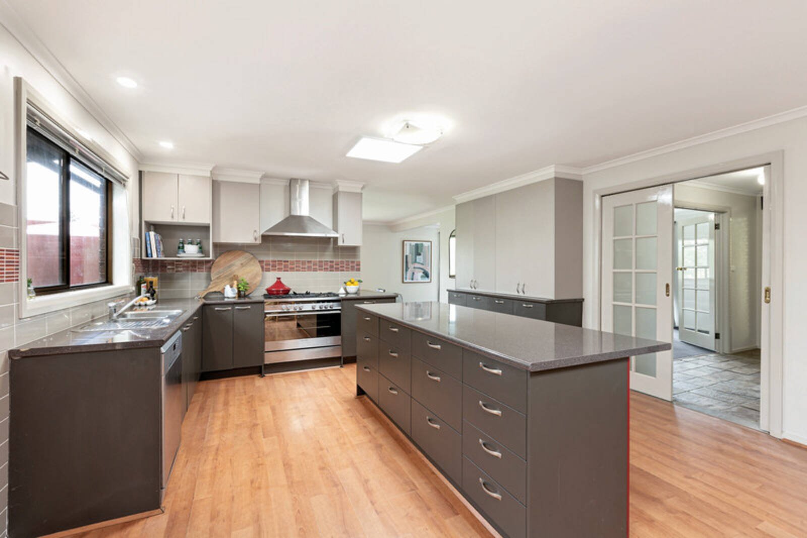 The kitchen is open plan with 900 gas stove and electric oven and range hood. There is a dishwasher, island bench and an oversized wall pantry.