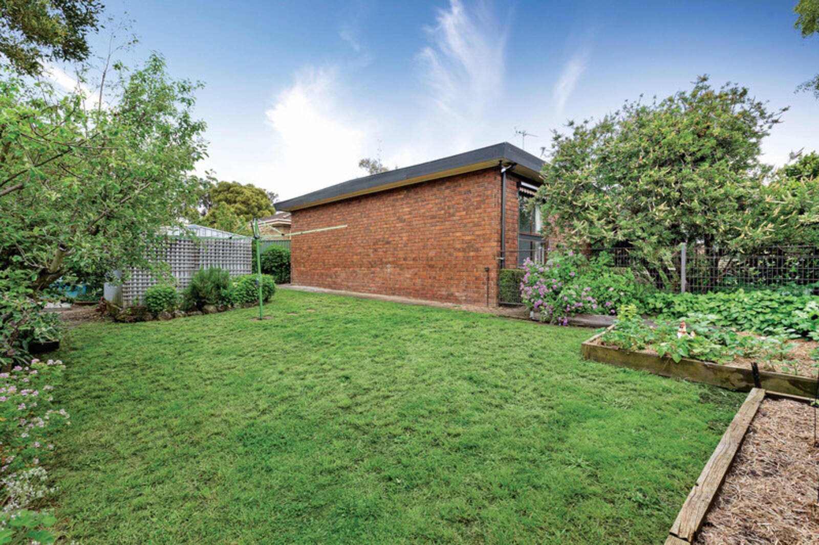 The back yard is complete with gardens, entertaining area, vegetable patches, sand pit and garden shed.