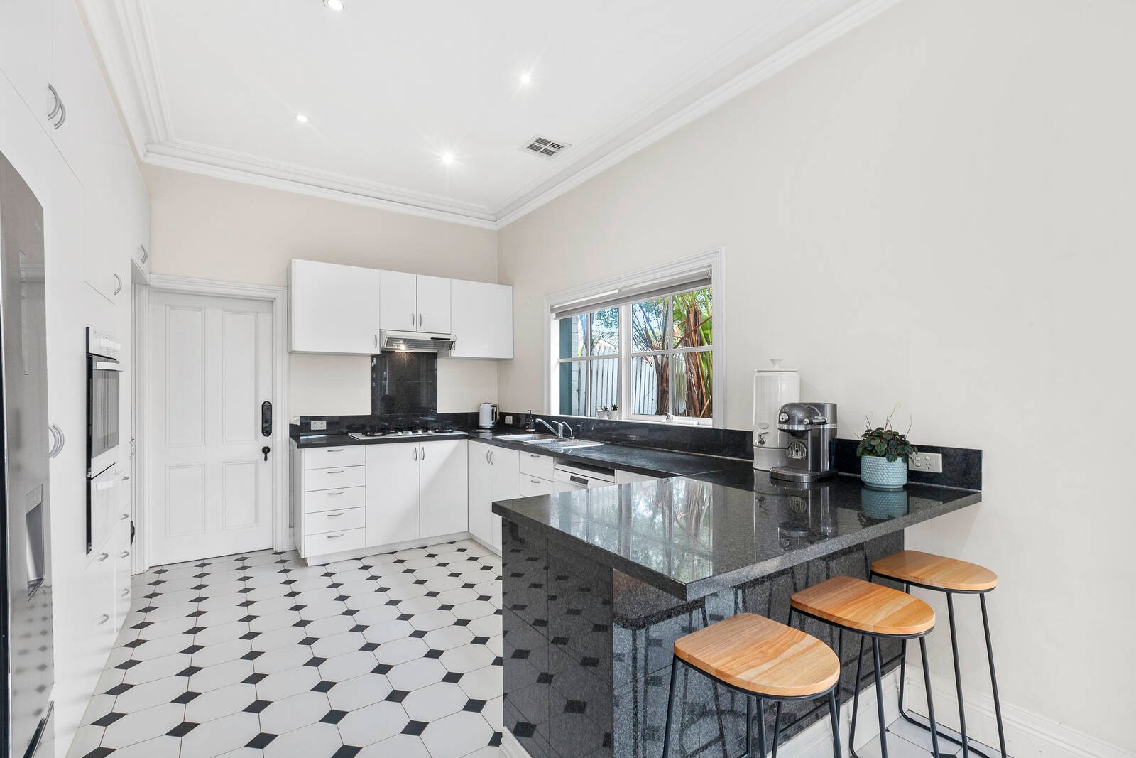 Privately positioned beyond established gardens, a traditional tuck-pointed and timber facade with a sunny return-veranda introduces the existing residence. Gracious spaces revolve around a double height atrium and sweeping staircase with expansive formal and informal living zones warmed by original open fireplaces. A modern classic kitchen, finished with black granite benches, stainless steel appliances and white cabinetry, looks across brick paved entertaining to endless gardens.