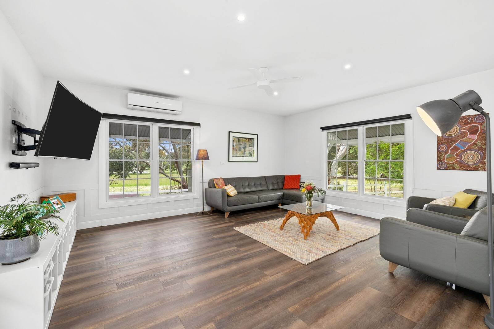 Set on approx. 5 acres, an inspection of this stunning property is a must, from the moment you walk in you’re sure to be impressed with polished timber floorboards throughout and the wonderful attention to detail that has not been spared. Comprising of three good size bedrooms two with built-in robes while the master features beautiful freestanding bed head, built-in robes, ensuite and gorgeous French doors that lead to private decking area perfect to relax after a hard day. The family bathroom is perfectly located, comprising of vanity, bath, shower and separate toilet.