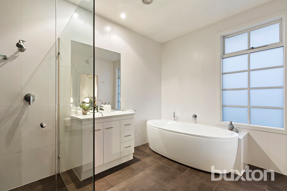 Two very spacious bedrooms, one with built in robes and both with original open fireplaces and ceiling fans, offer flexibility downstairs while upstairs a stunning parent's domain is the prefect retreat to escape and unwind. Overlooking the rooftops of Brighton the master suite is large and breezy with a shuttered Juliette style balcony catching the sea breeze. With enough room for a sitting area plus fully fitted walk in robe and designer bathroom boasting an indulgent ovoid bathtub this is a truly luxurious space.