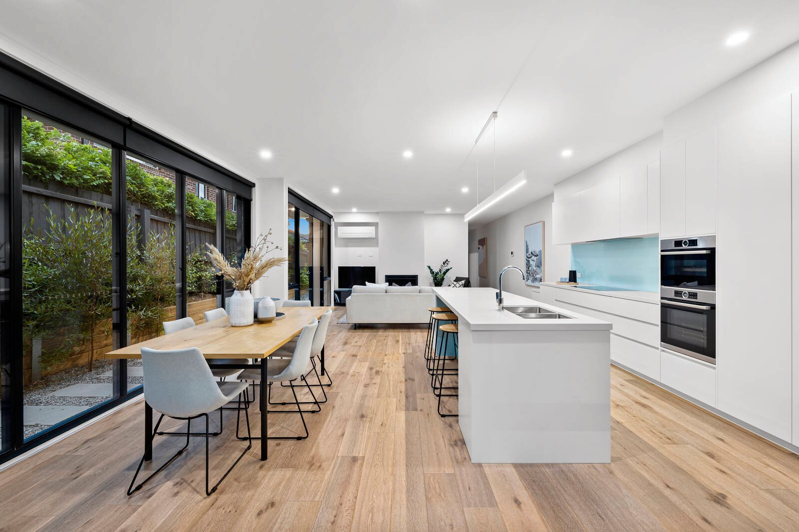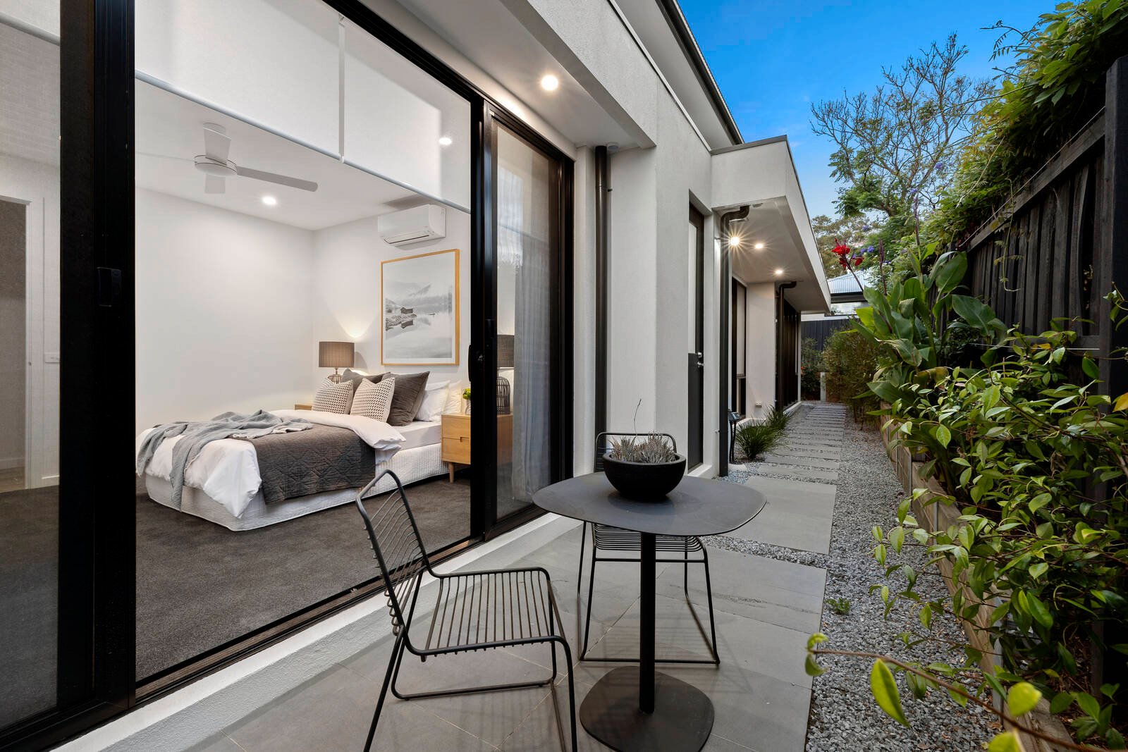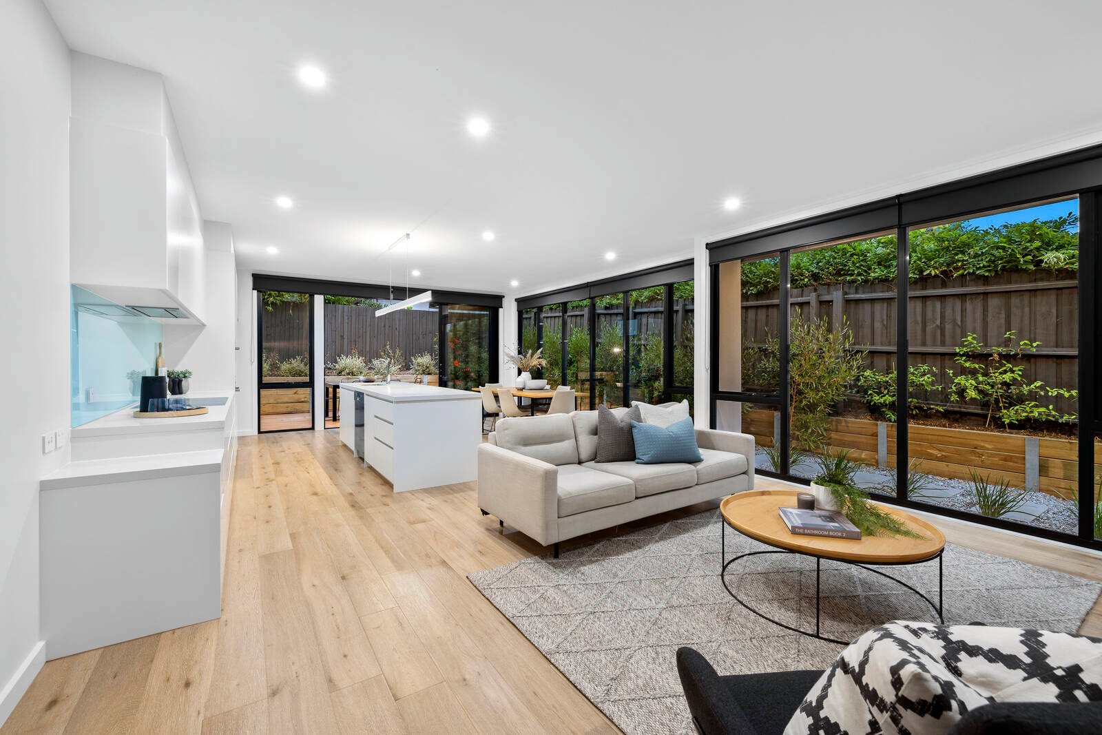 Offering an abundance of storage with a fitted storeroom, plus double or triple built-in robes for each bedroom, the home is styled with sheer and block-out window-furnishings and semi-commercial double-glazing in the latest black-aluminium frames. Secured by an alarm and video-intercom and wrapped by well-conceived outdoor space, the home is nestled in auto-watered gardens on three sides, with parking for at least two -cars (including an auto-garage) and a deep balcony on high.
