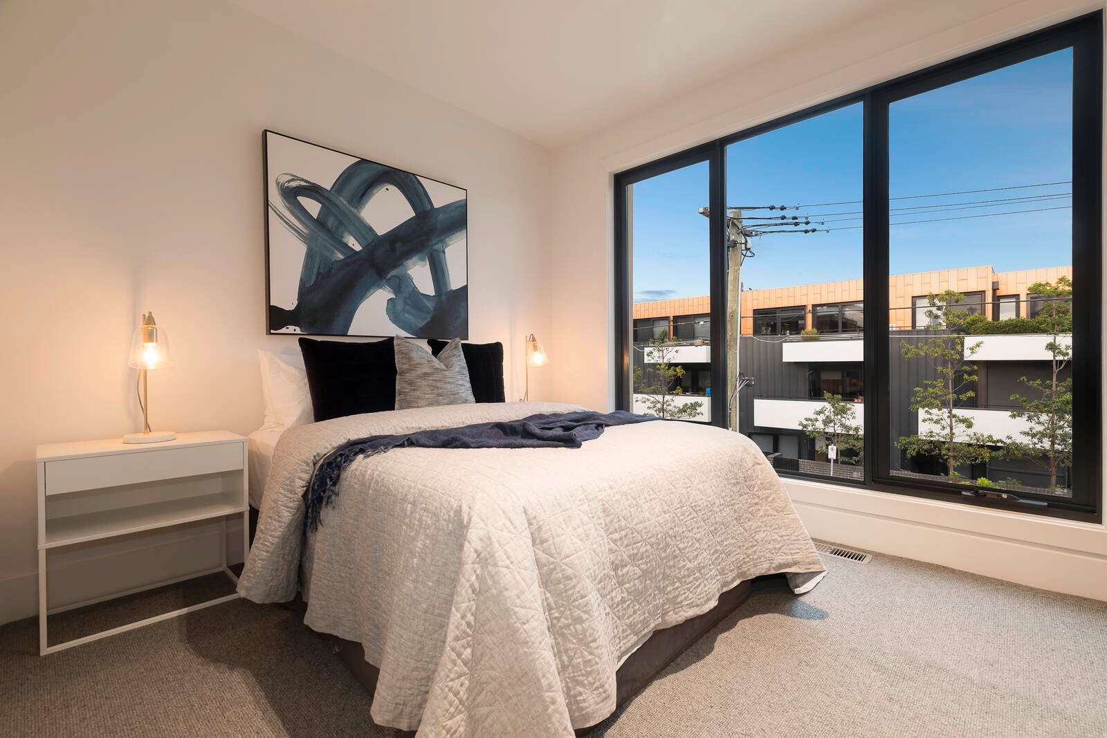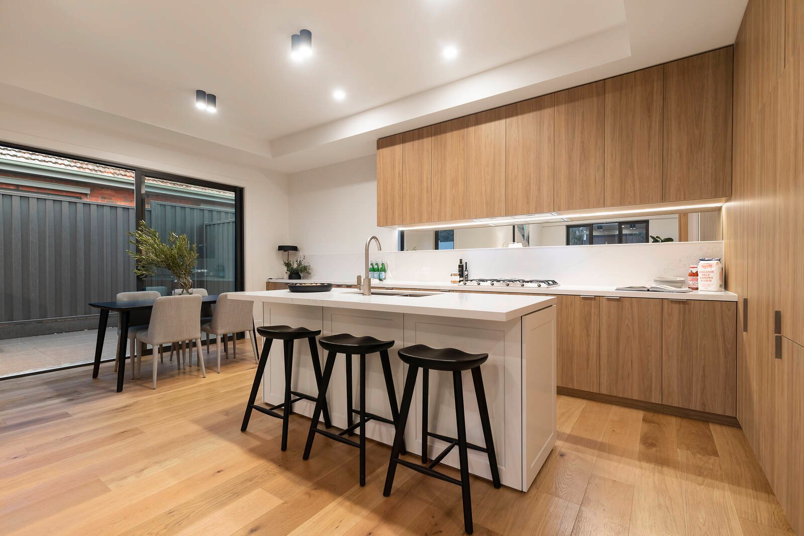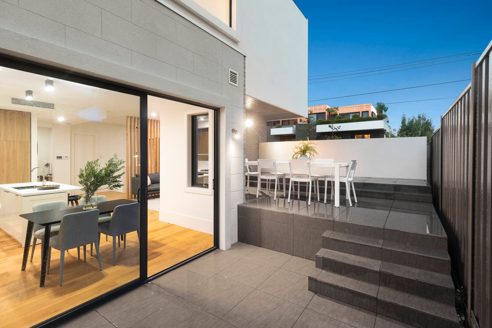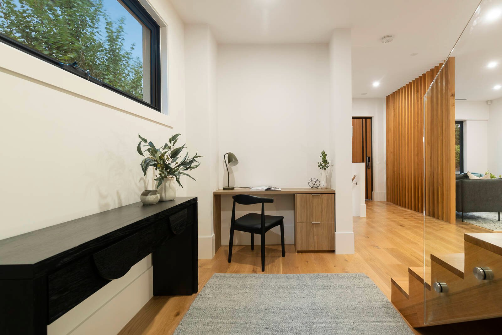 Transcending fashion with a state-of-the-art Smeg appliance kitchen, slimline-tiled bathrooms, Calacatta-stone benchtops, oak floors and the latest textural loop carpets, the home is custom-detailed at every turn – from eye-catching designer lighting for the stairwell (framed in a front window), to gas and water-points for the BBQ courtyard, to a private double basement garage.