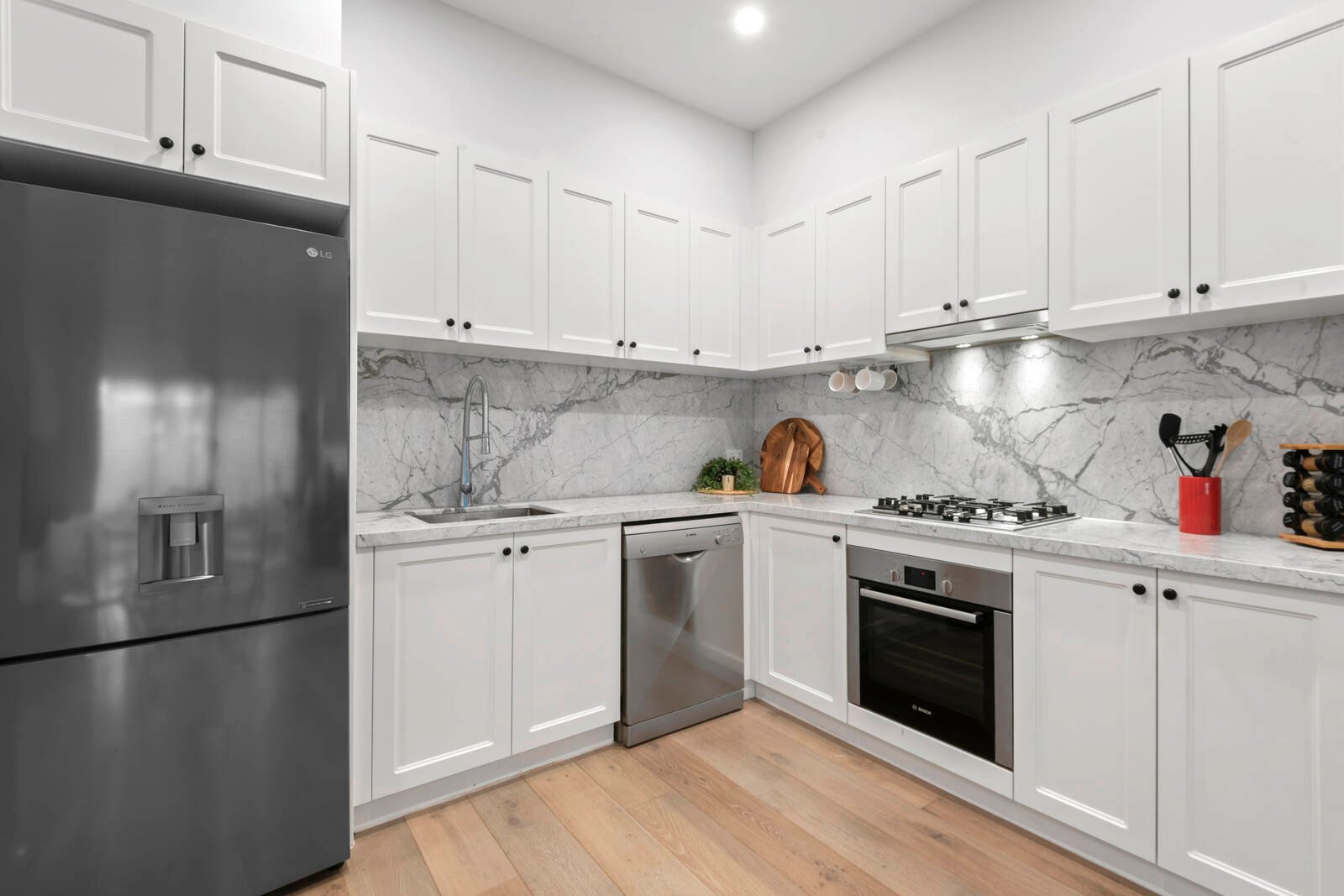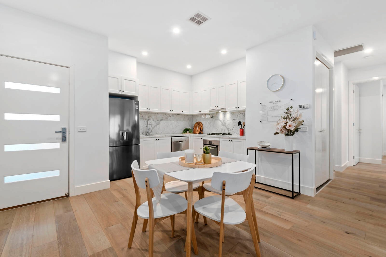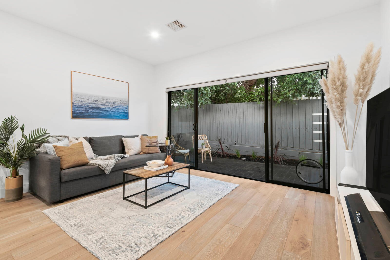 Combining luxury living with a low-maintenance lifestyle, this sleekly styled rear home opens with an airy open-plan living and into three versatile bedrooms - the third perfect for your little one or as a work-from-home office. Fitted with a state-of-the-art Bosch appliance kitchen, high quality climate-control ducted system, a hidden European laundry and a sparkling fully-tiled bathroom. This single-storey home showcases exceptional finishes with custom cabinetry, Italianate Staturio and Nero Marquina marble benchtops and splashbacks, glossy porcelain tiles and premium oak floors throughout.