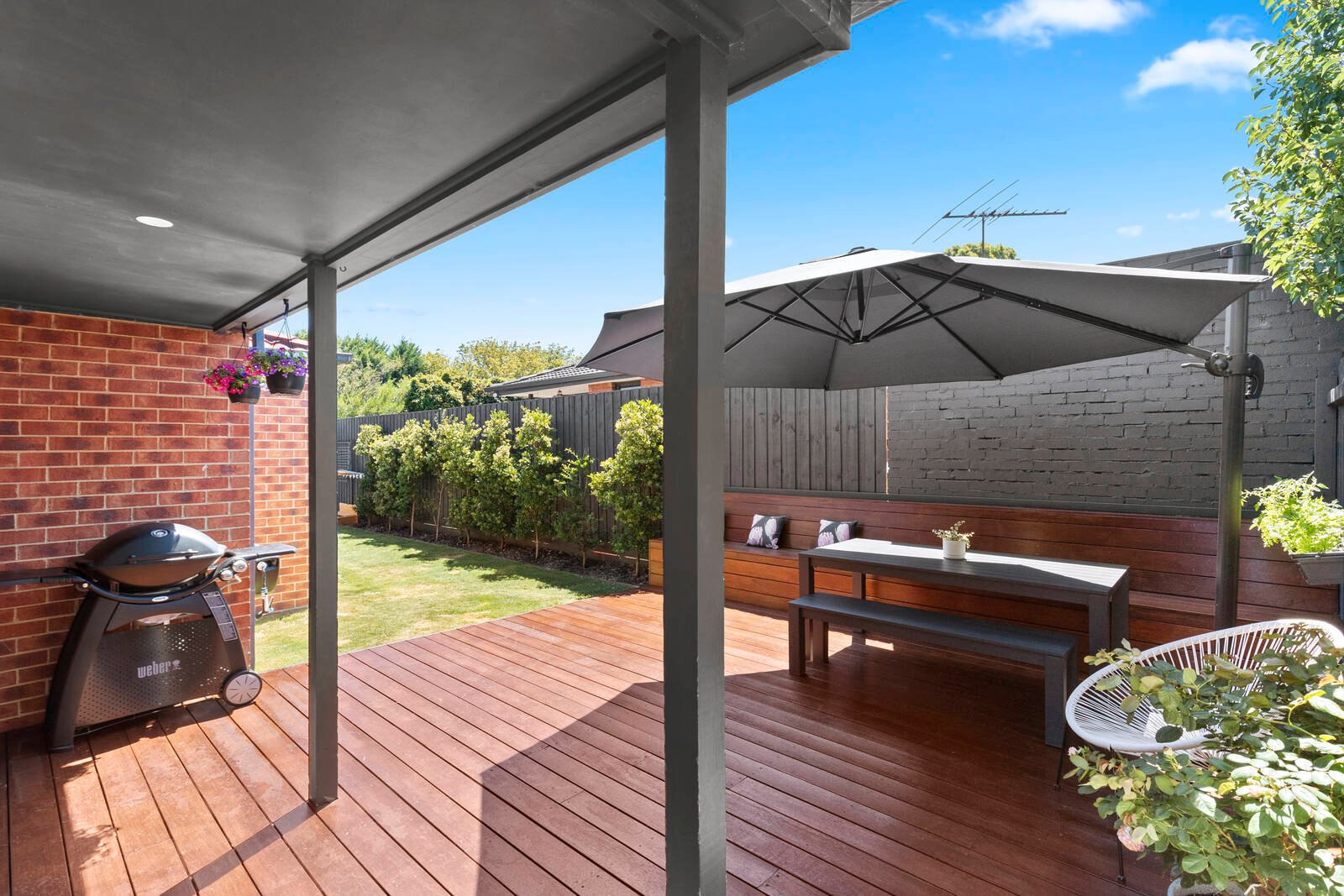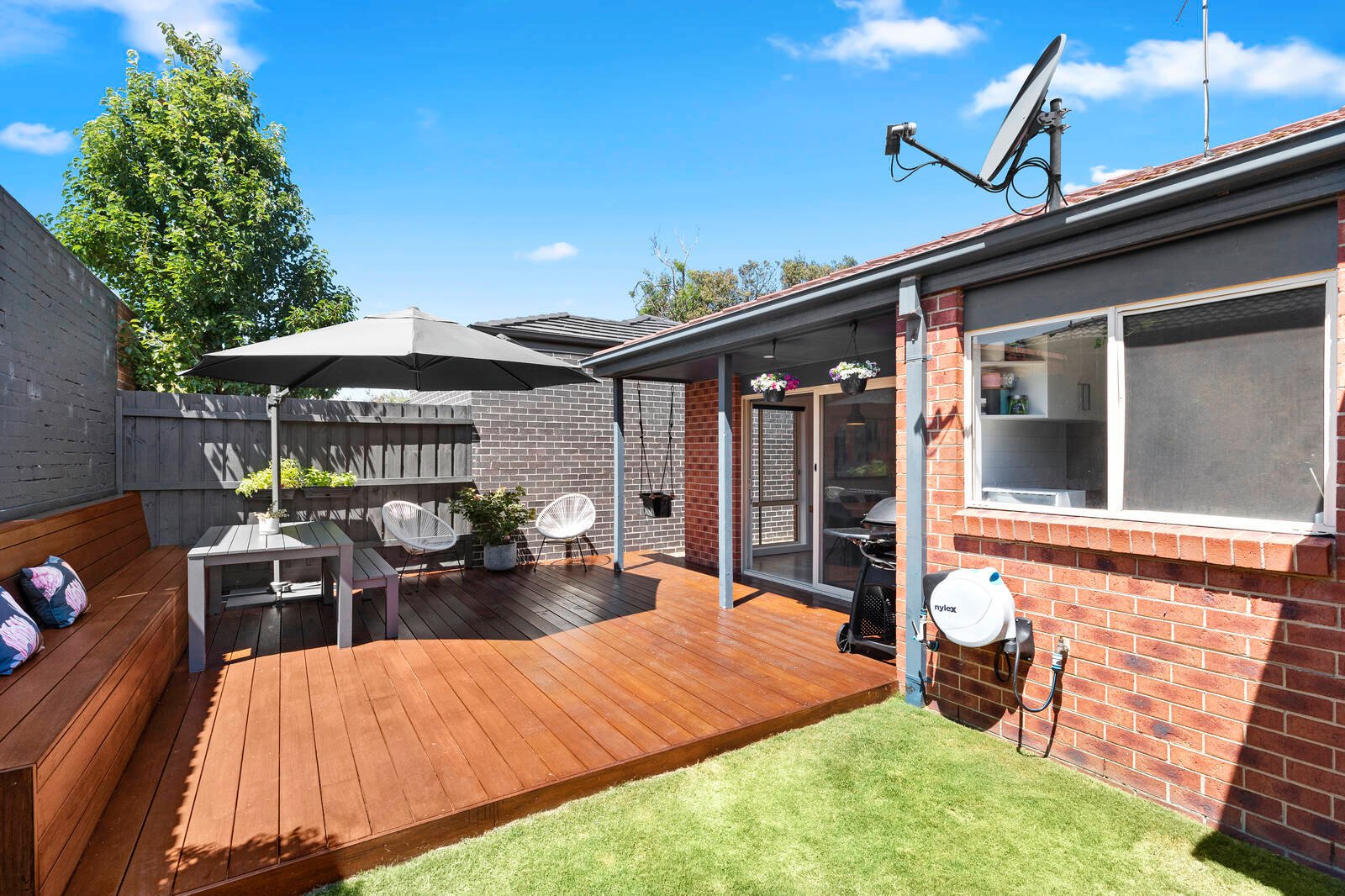 Oriented to capture streams of northern sunshine, the well-equipped kitchen and generous living/dining zone offer ample space for quiet evenings or fabulous get-togethers that can effortlessly spill out to the sundrenched alfresco deck. Out here, built-in seating and the child-friendly lawn create an appealing space to relax or entertain in the fresh air.