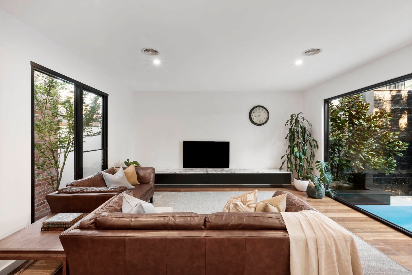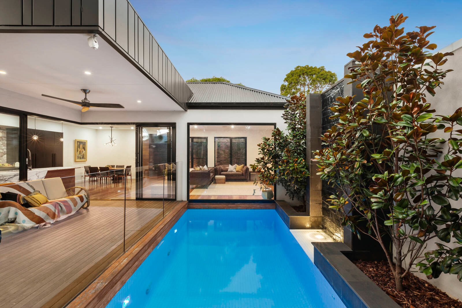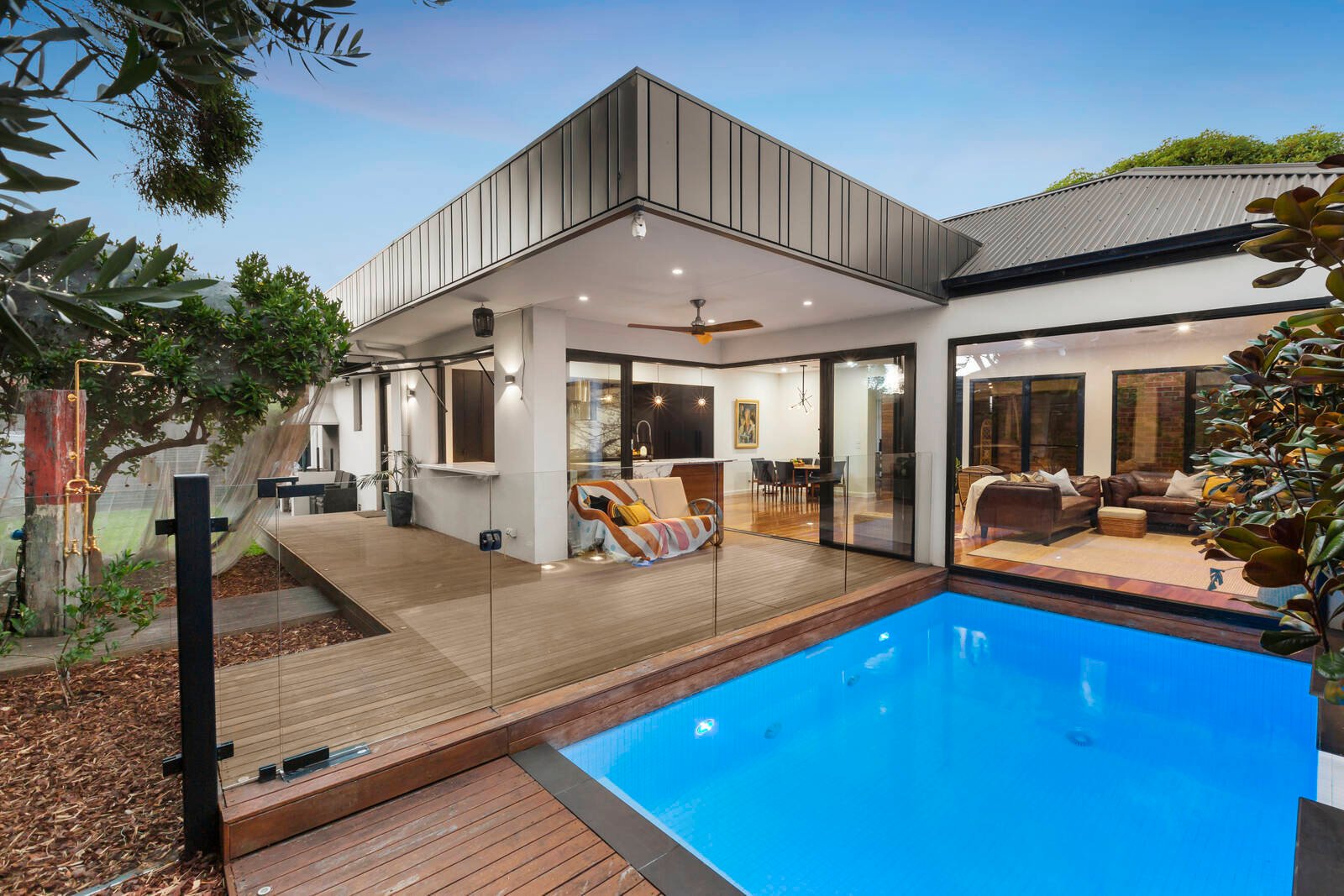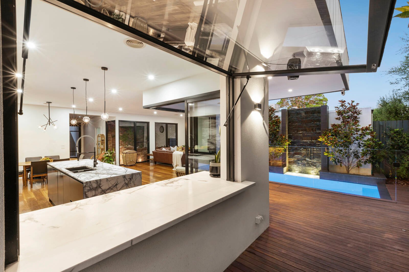 The front entrance is an impressive, custom-built glass and metal door providing plenty of natural light. Welcomed by a flat-gabled facade of recycled hardwood, the home unfolds with an atrium-centred design featuring open-plan living, pillarless corners leading into a fan-cooled poolside al fresco space. The family zone is complimented with a cutting-edge V-Zug appliance kitchen that opens to an immense servery window, while a quiet bedroom wing includes a generous master-suite with an original feature brick wall, steps to podium-deck.