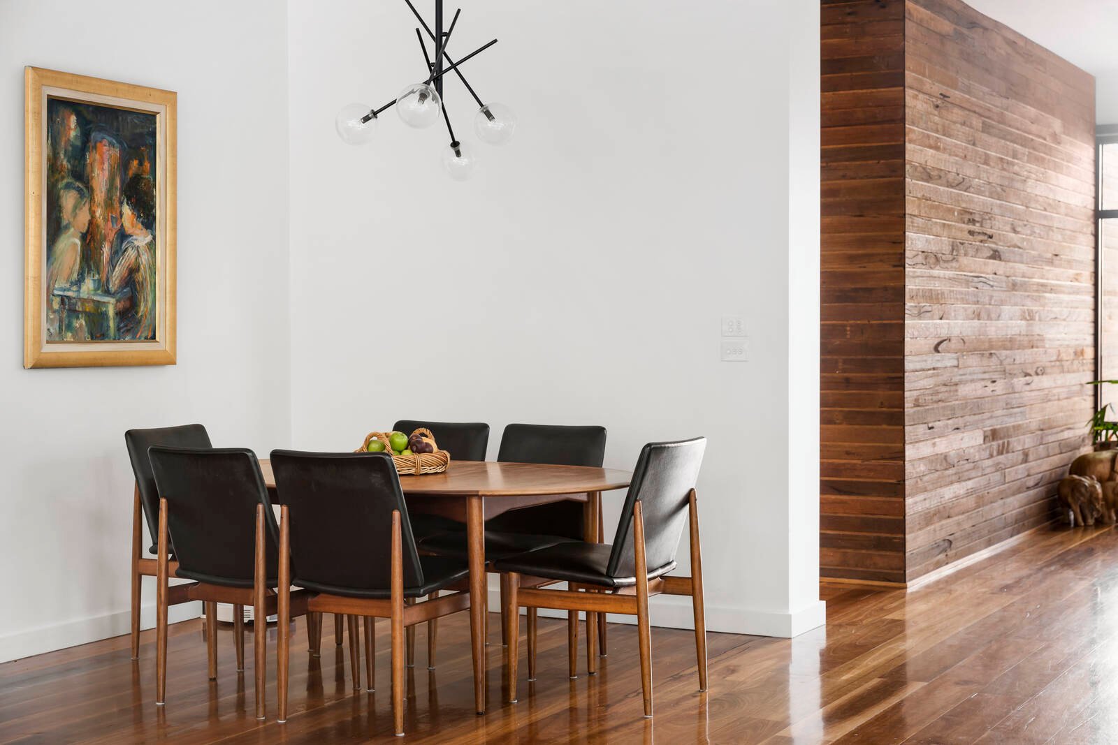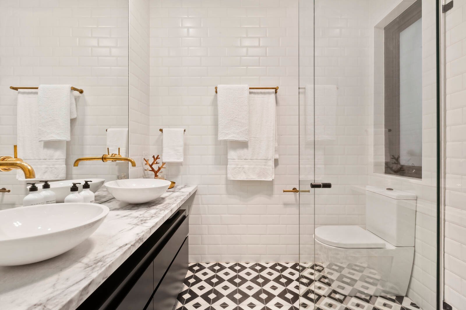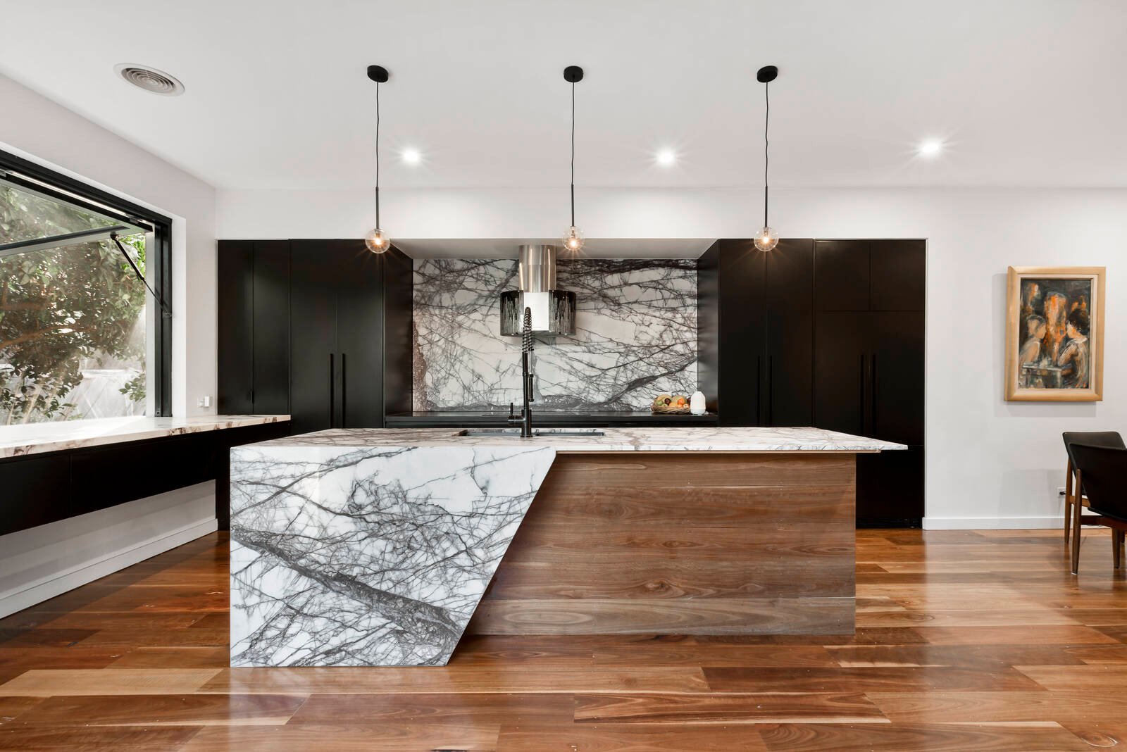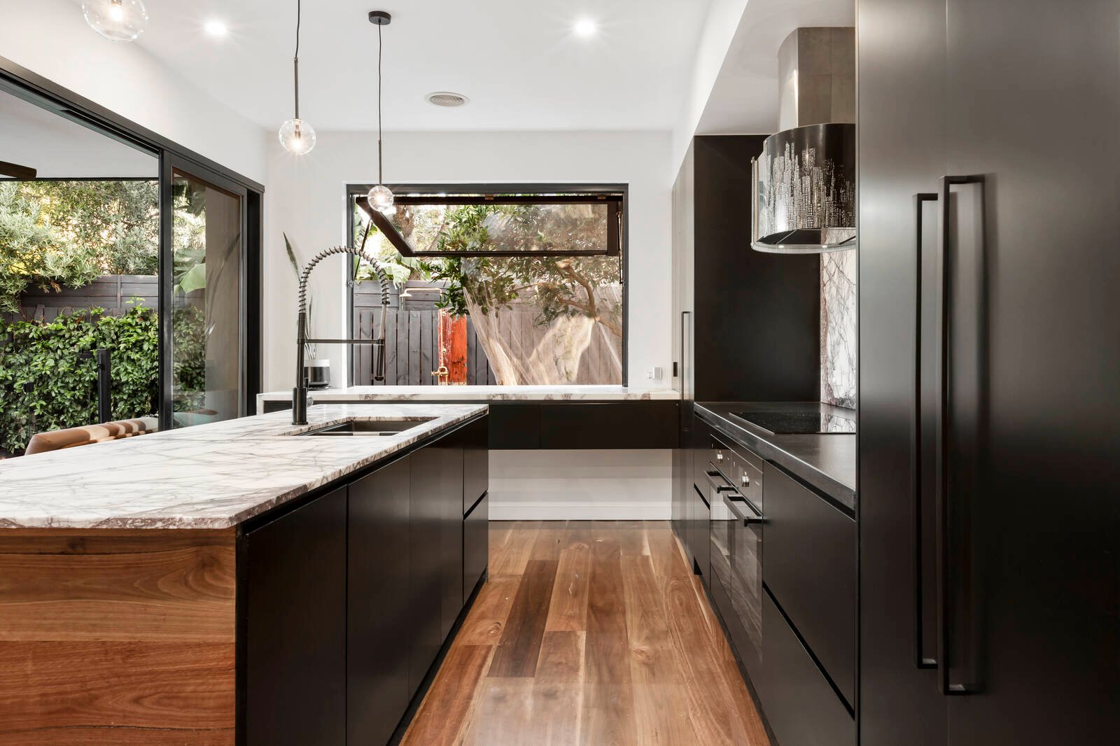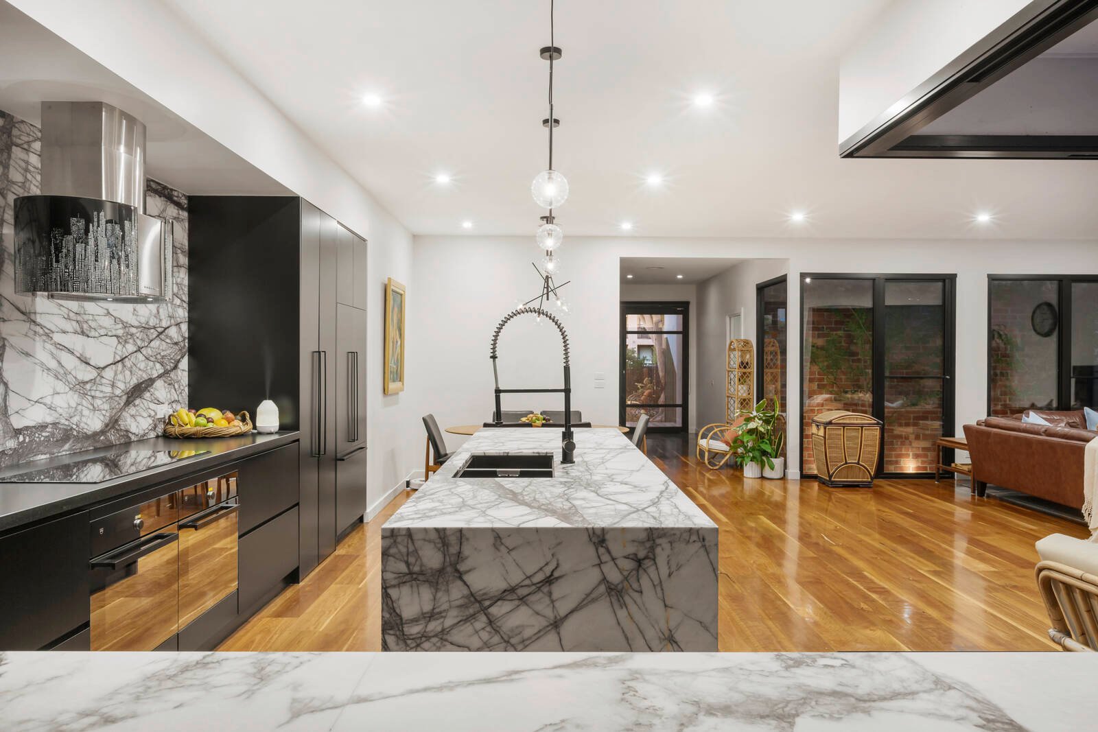 Dramatically detailed with premier New York marble benchtops and a kitchen splashback echoed in a striking ‘city skyline’ Falmec rangehood, the home features hard black granite benches and sleek spotted gum flooring. Indulging an eye for authentic finishes at every turn, the home’s interiors move from satiny black 2-Pack cabinetry to cool Astra Walker brass tapware floating above stone sinks and genuine encaustic bathroom tiles. The home is an exceptional mix of natural rustic elements and high-end powder-coated perforated panelling.