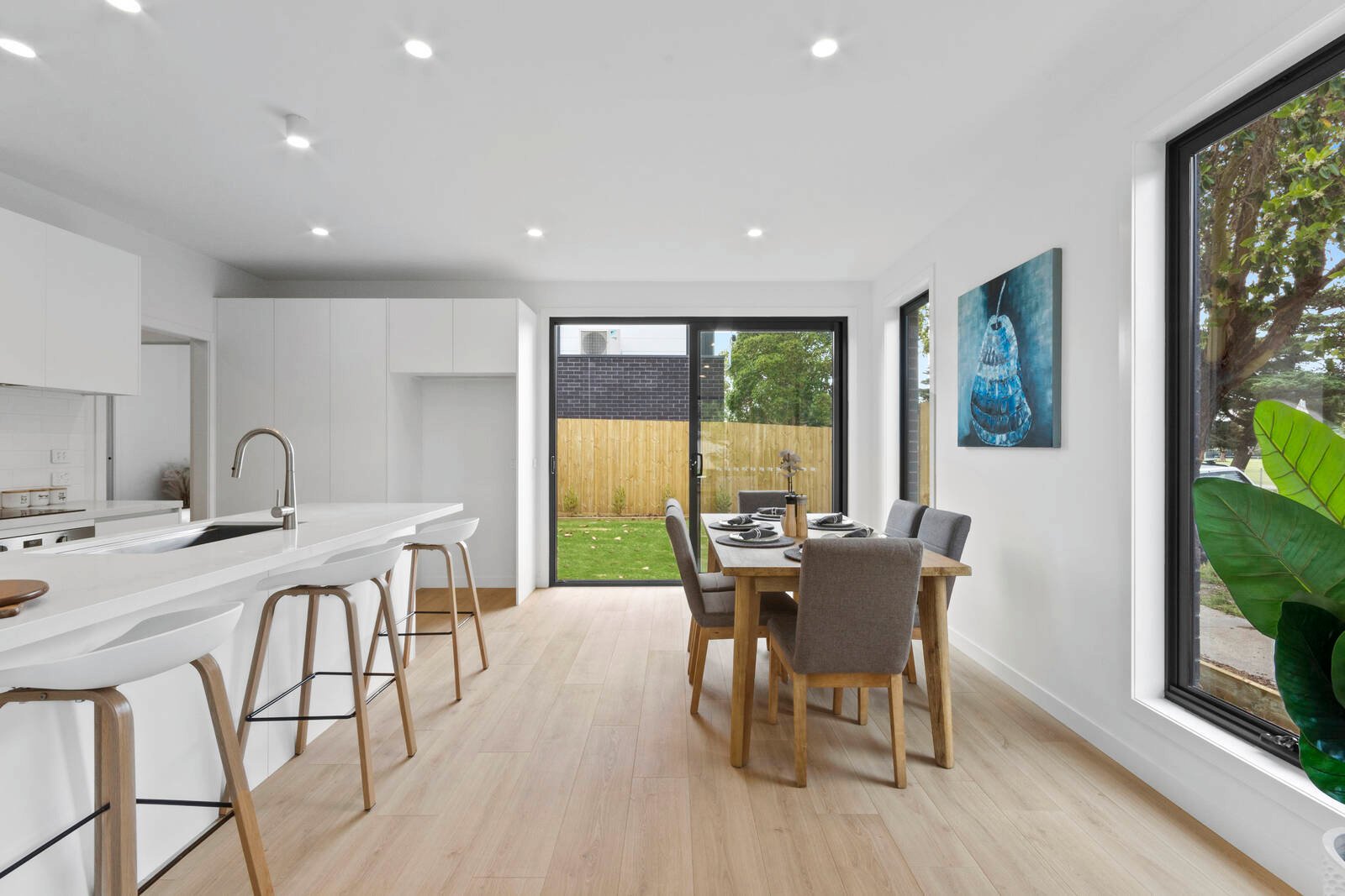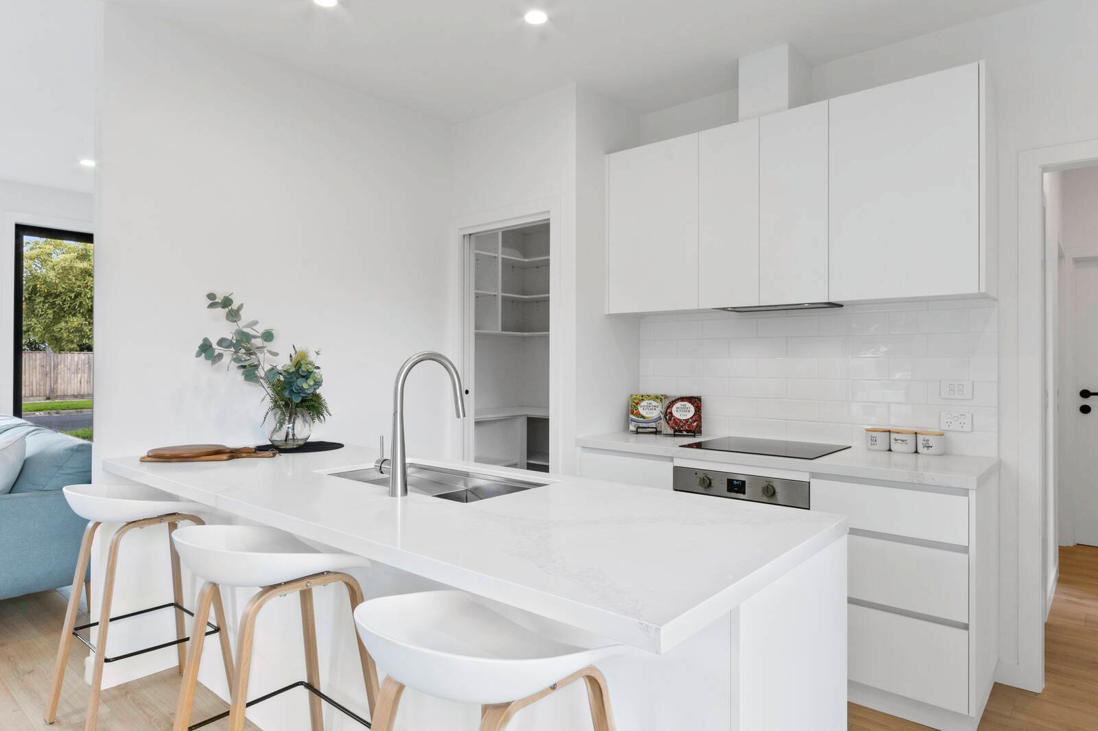 A wide entrance hall, striking feature staircase, soaring high void and crisp light interiors with timber accents creates an impressive introduction to the home. The ground floor consists of a spacious open plan living, dining and kitchen with north-facing windows bringing in plenty of natural light. The central kitchen is finished in elegant white with beautiful stone benchtops, sleek modern cabinetry, quality appliances including induction cooktop, classic subway tile splashback, and excellent storage provisions including walk-in pantry. Perfectly positioned to overlook the dining and access the rear courtyard, this is a fantastic layout for those who love to entertain.
