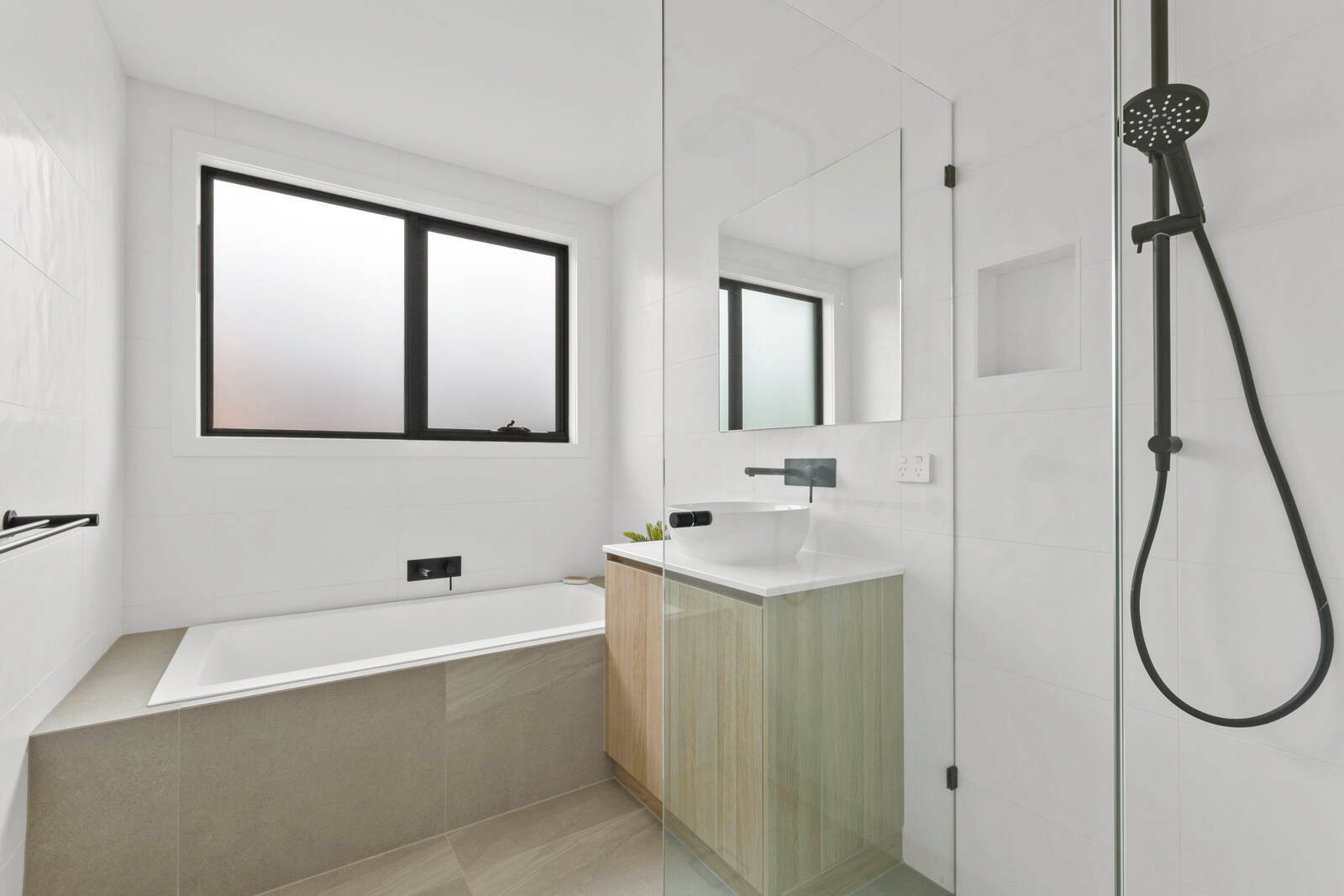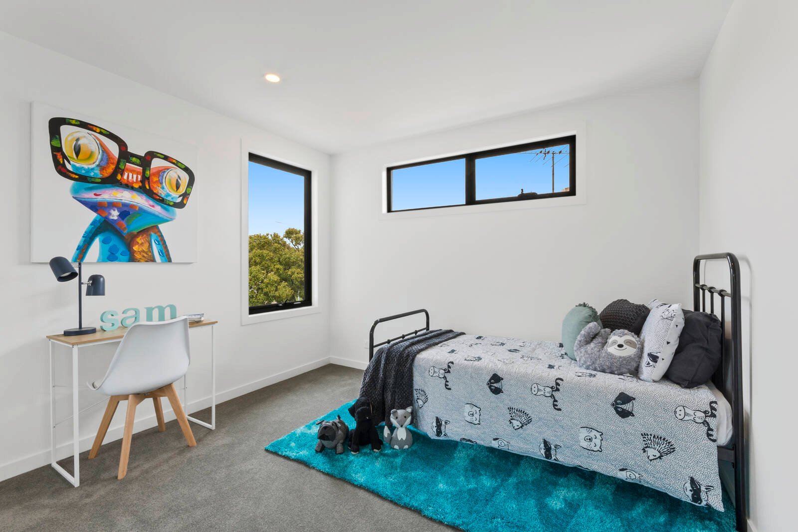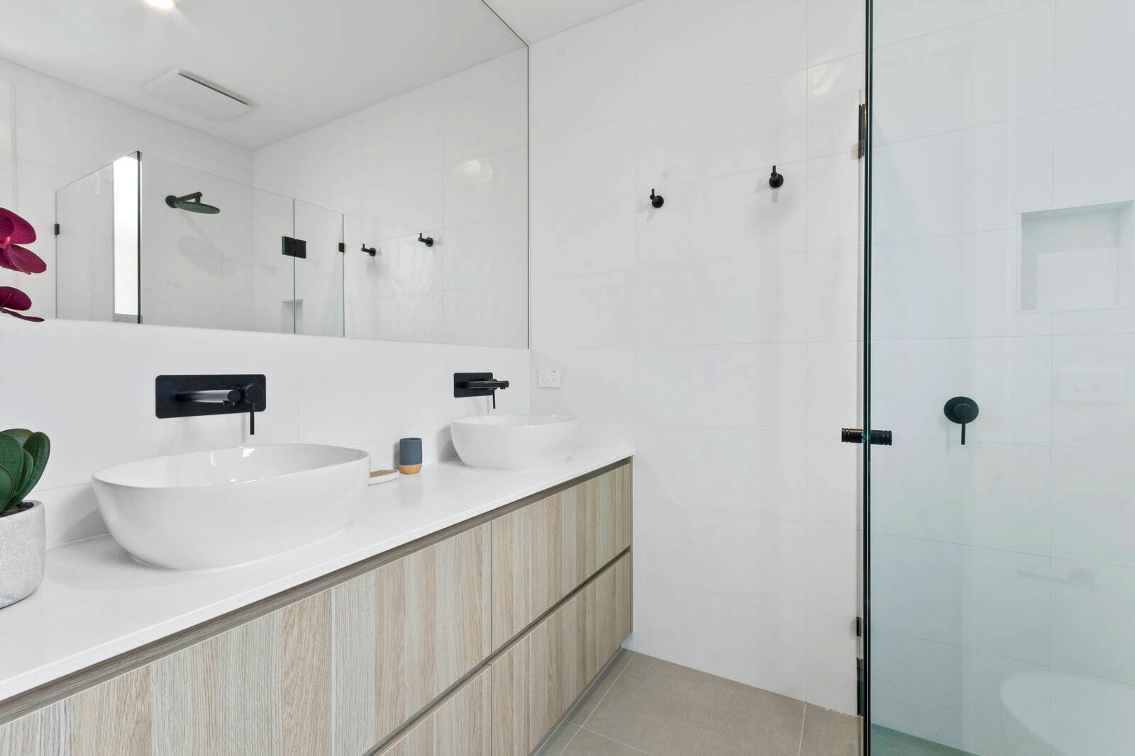The master bedroom is also situated on the ground floor, includes walk-in robes and ensuite showcasing floor-to-ceiling tiles, double vanity, frameless glass shower and quality black tapware and fittings. Two additional bedrooms upstairs include built-in robes, picturesque elevated views and are serviced by a central bathroom that continues in the luxurious theme of the home. A second living area on this floor creates the perfect kids’ retreat or guest quarters, and completes the highly functional floorplan.