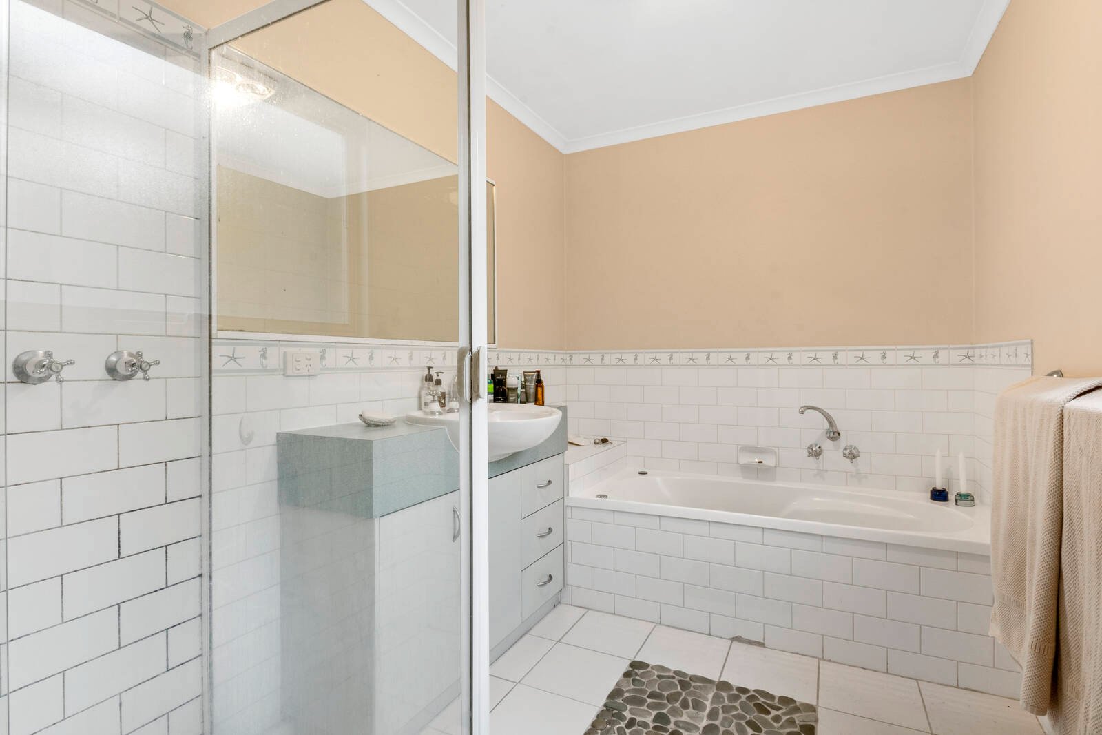 Comprising two bedrooms, both include built-in robes and are serviced by an updated bathroom featuring white subway tiles, feature stone floor tiles, modern vanity and quality fittings.