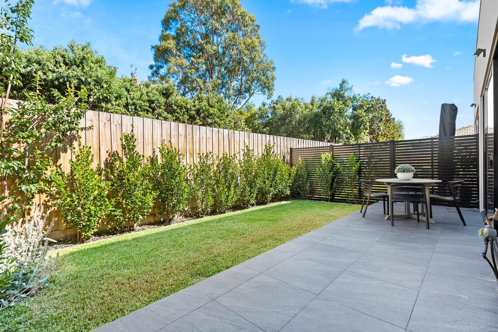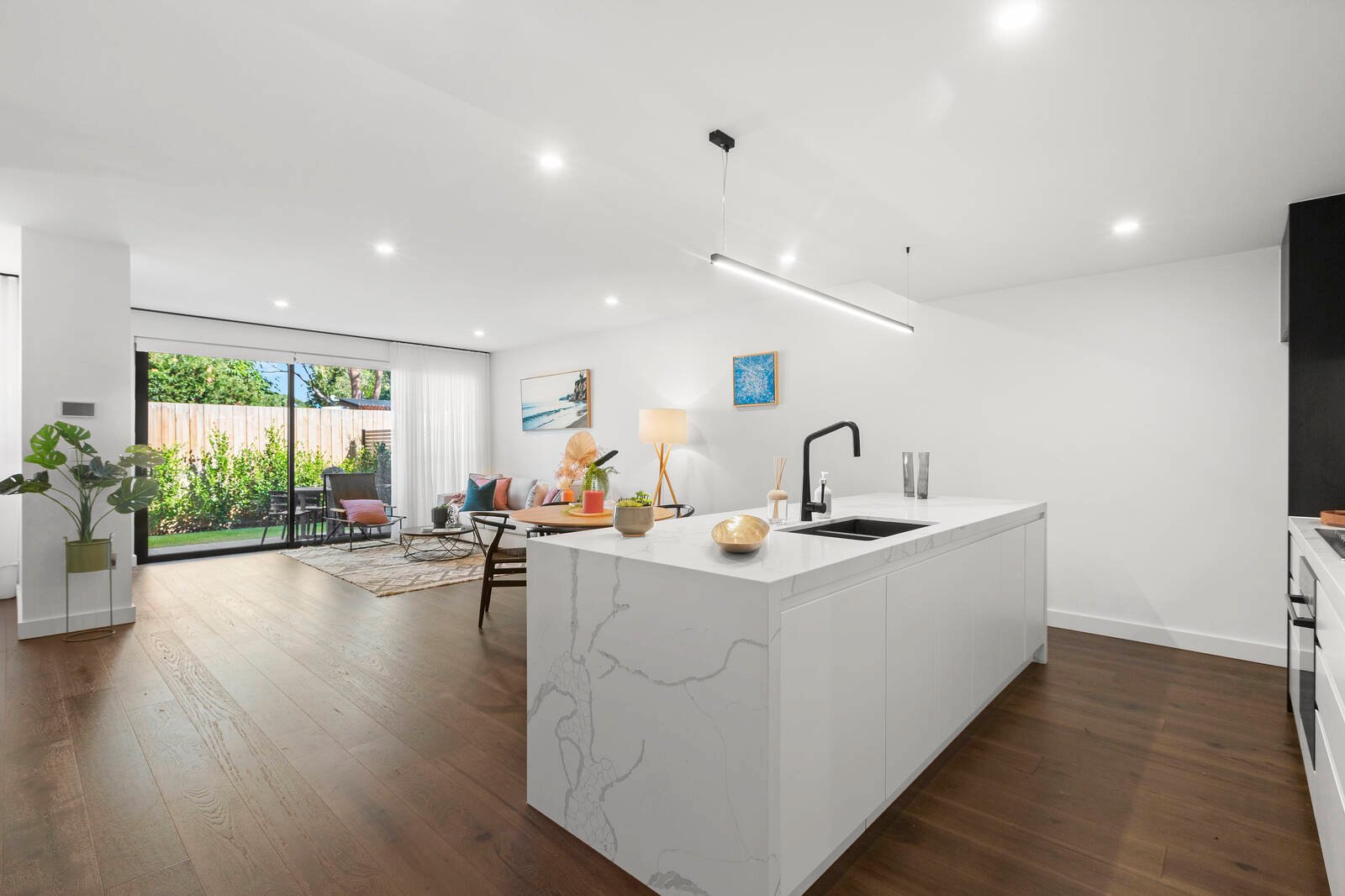 A contemporary design harmonises with the free-flowing interior, where sublime finishes complement the streamlined stone kitchen featuring quality stainless steel appliances, and light-filled open-plan living/dining zone, unfolding to a private paved terrace and landscaped courtyard – an indulgent setting for outdoor entertaining.