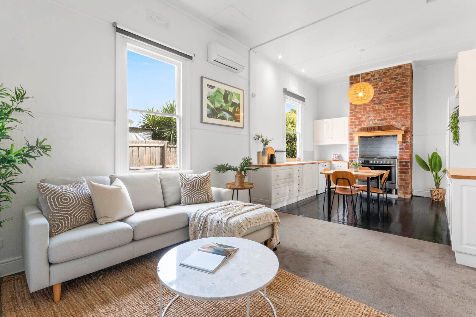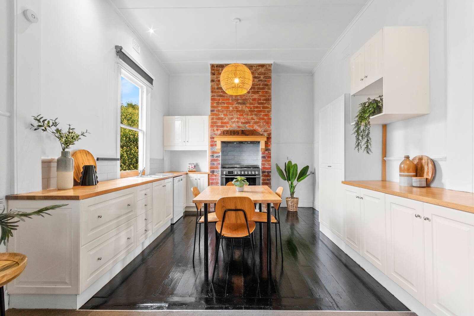 Moving through to the heart of the home, an open plan kitchen, meals and living area exudes a homely warmth featuring an original brick chimney breast as its centrepiece. Includes quality appliances including 900mm Bosch freestanding oven and cooktop, Beko dishwasher, quality cabinetry and classic subway tile splashback, this is a beautiful space to cook, dine, entertain and relax.