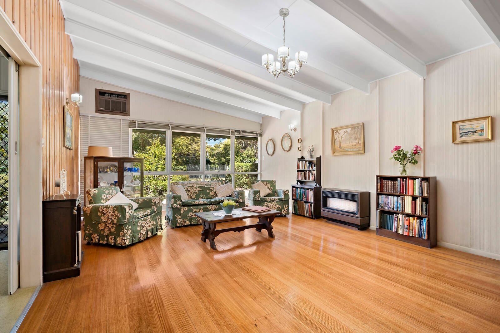 A retro style kitchen with timber cabinetry, gas cooker and ample storage space overlooks the dining room for easy entertaining; while a living room at the rear opens through glass sliding doors to a north-facing entertainment terrace and private western gardens with plenty of room for the children to play.