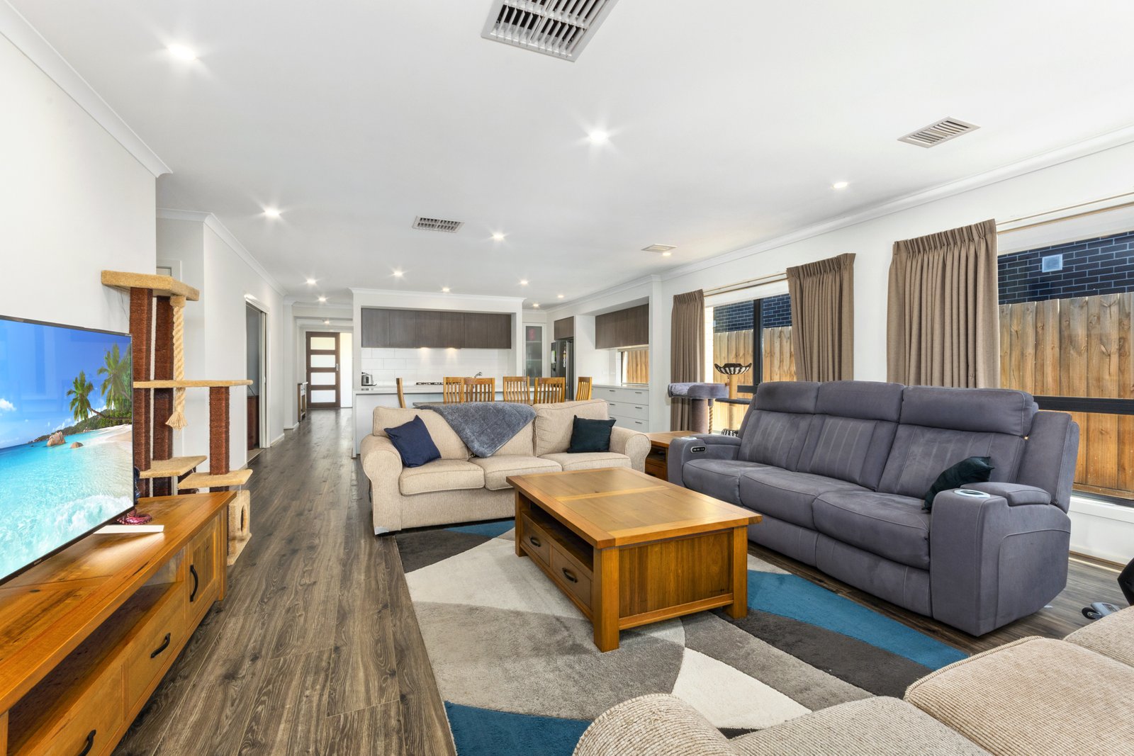 Two separate living zones provide a wonderful selection of spaces to gather, retreat or entertain. The main living consists of a large open plan kitchen, family and dining room with plenty of natural light. The magnificent kitchen features a central island bench, stone benchtops, generous cupboard and bench space, stainless steel appliances and a huge walk in pantry. Positioned to oversee the living, dining, al fresco and out to the backyard, this kitchen is designed for easy everyday living and impressive entertaining. A second lounge area offers a quiet space to relax or watch a movie. It is also the perfect space for the home office. The home also provided heating and cooling throughout to make life more comfortable and solar to help minimise costs.