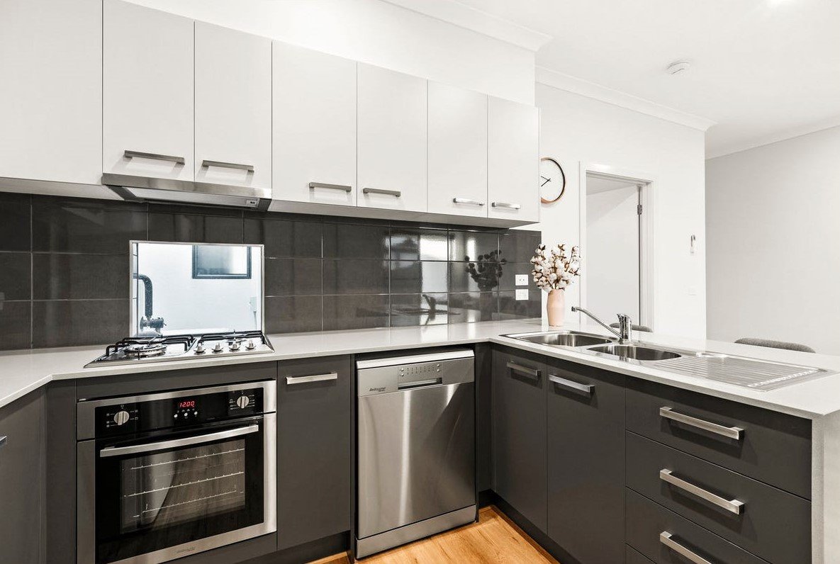 Kitchen: 600mm gas cooktop, waterfall 20mm stone benchtop, oven, tile splash back with feature window, built-in pantry, downlights, dishwasher, overhead cabinetry, overhang for breakfast bar, storage, laminate floorboards.