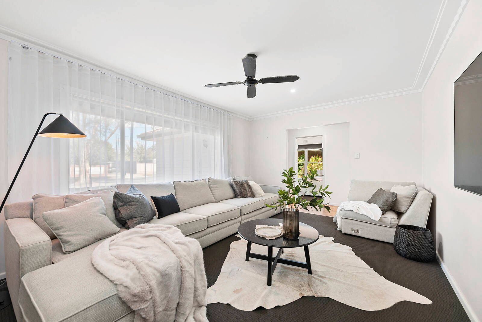 The generous size living area is positioned to the front of the home and is filled with natural light. Keeping the property comfortable all year round is gas heating and split system air-conditioning