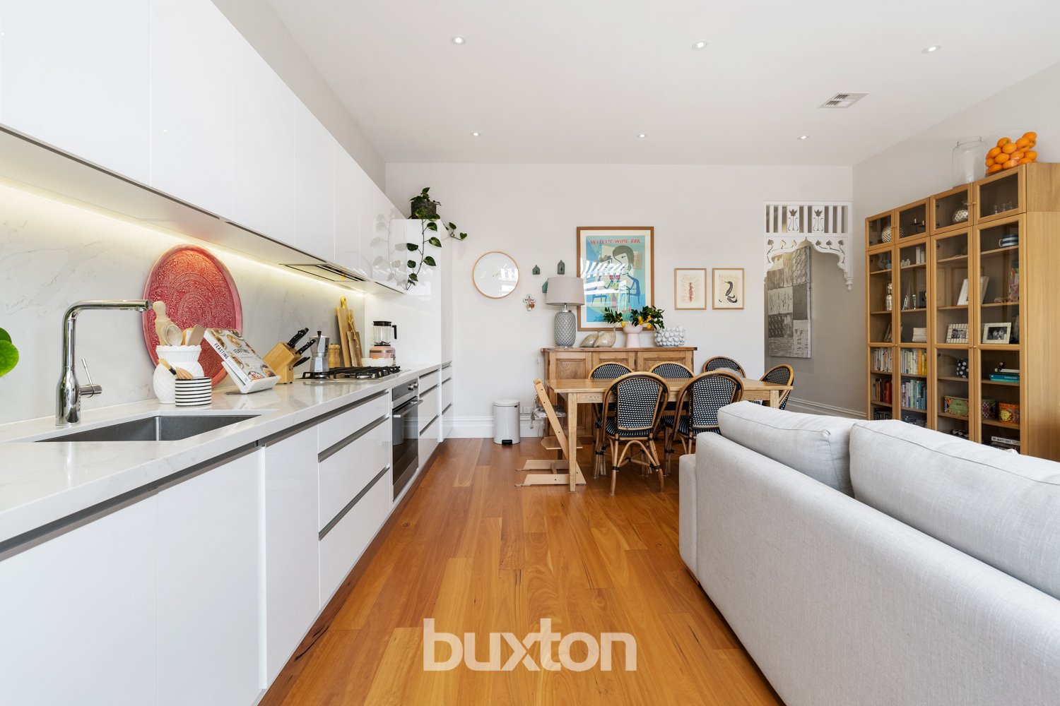 The floorplan boasts a large, open plan living space with updated kitchen featuring Caesarstone benchtops, integrated Miele dishwasher, gas cooking, and great storage within soft closed drawers.