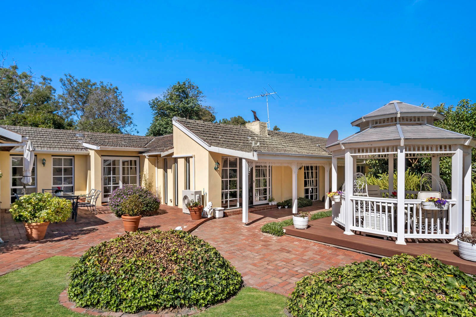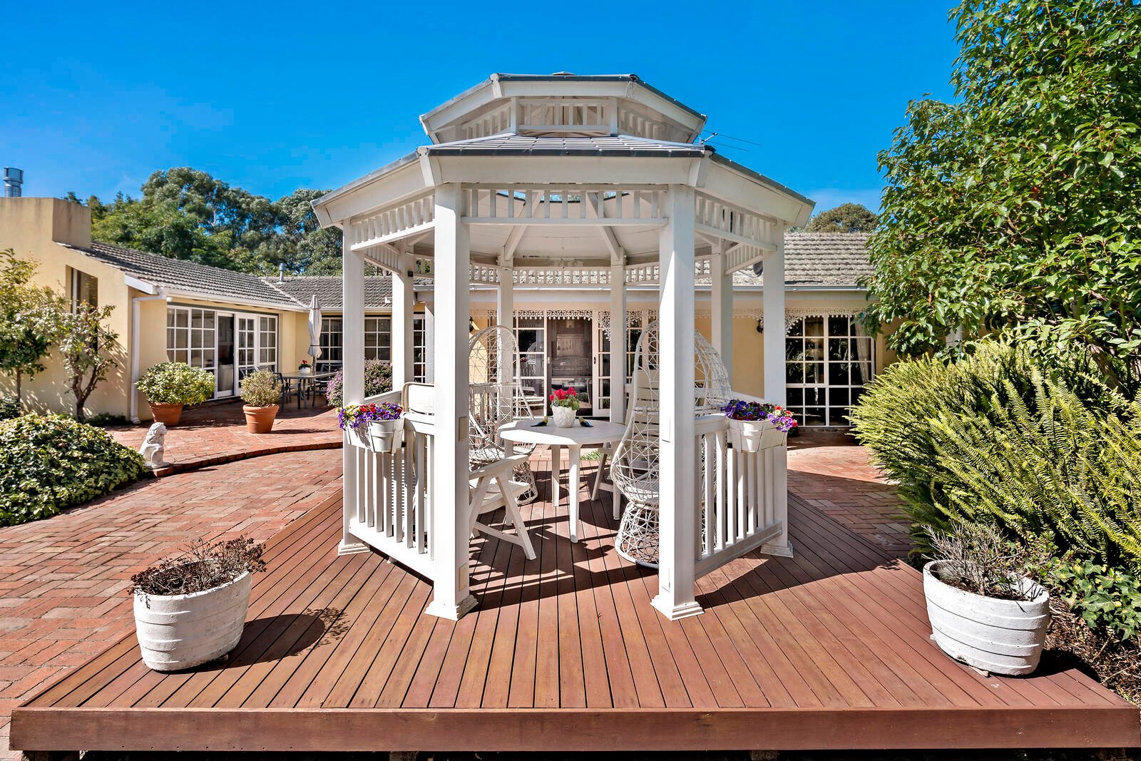 Glass sliding doors unfold onto a picturesque terrace for wonderful alfresco living and entertaining; while a gazebo is the perfect place to relax and unwind with a good book.
