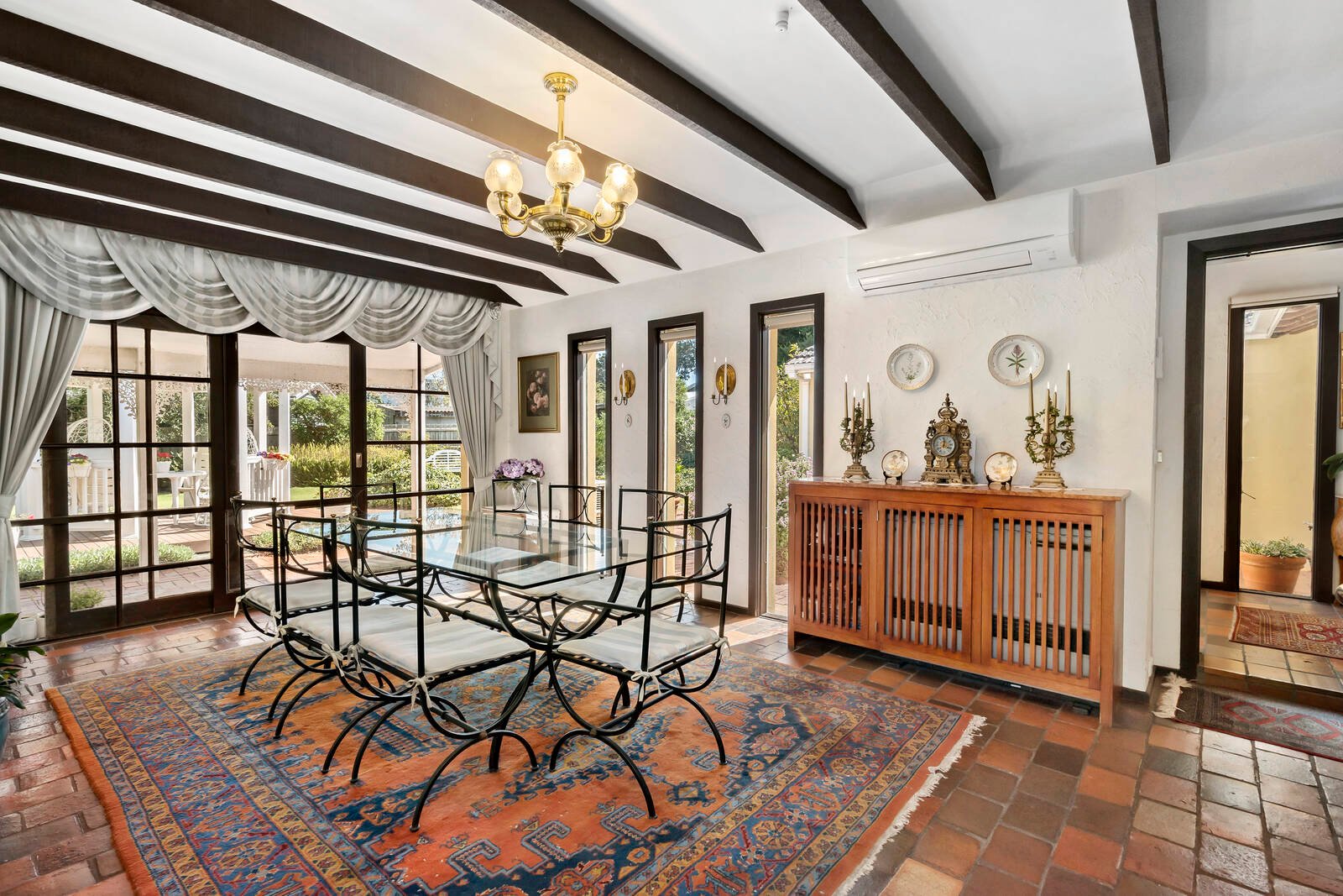 A sitting room and study inspire quiet relaxation; while an expansive dining room with stunning exposed beams offers a sun-splashed hub for entertaining.