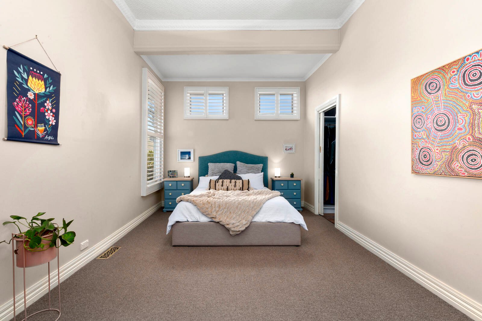 Comprising three bedrooms, the generous master includes walk-in robes and ensuite, the additional two bedrooms feature spectacular original fireplaces and are serviced by a central family bathroom, elegantly finished in classic subway tiles, quality fittings and a pretty floral feature wall. All bedrooms are fitted with plantation shutters, continuing in the timeless theme of the home.