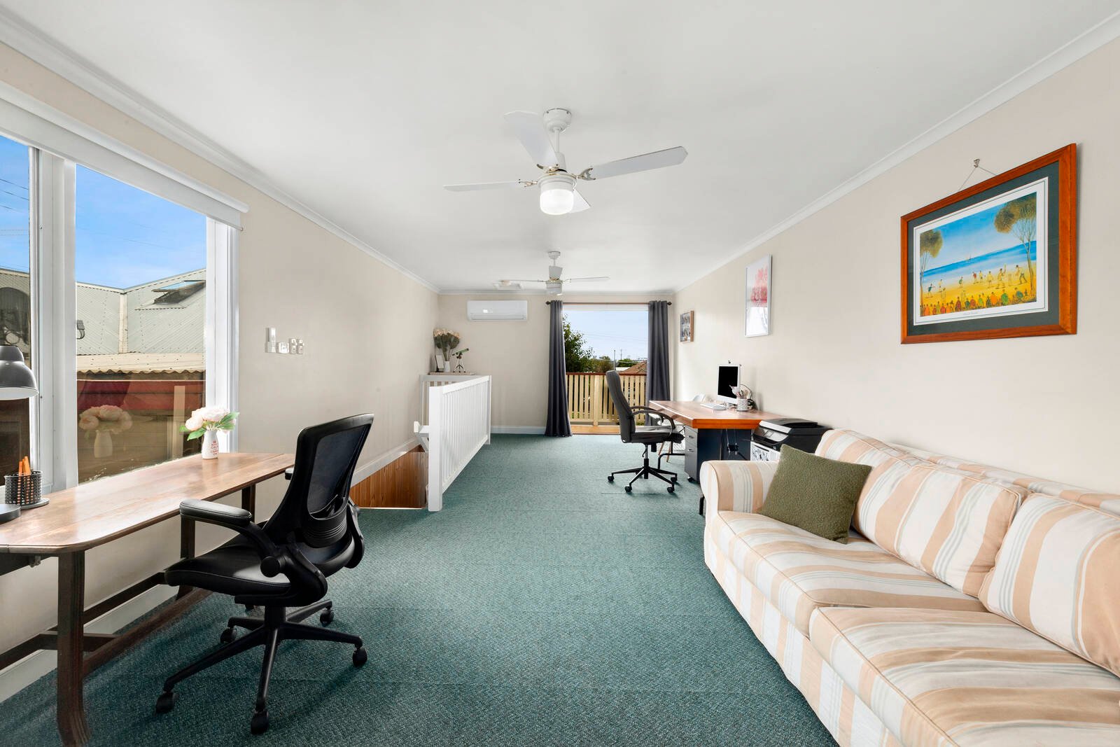Outdoors, the long single garage includes workshop space and features an upstairs studio, providing the ultimate home office with split system heating/cooling and balcony offering majestic views across the city.