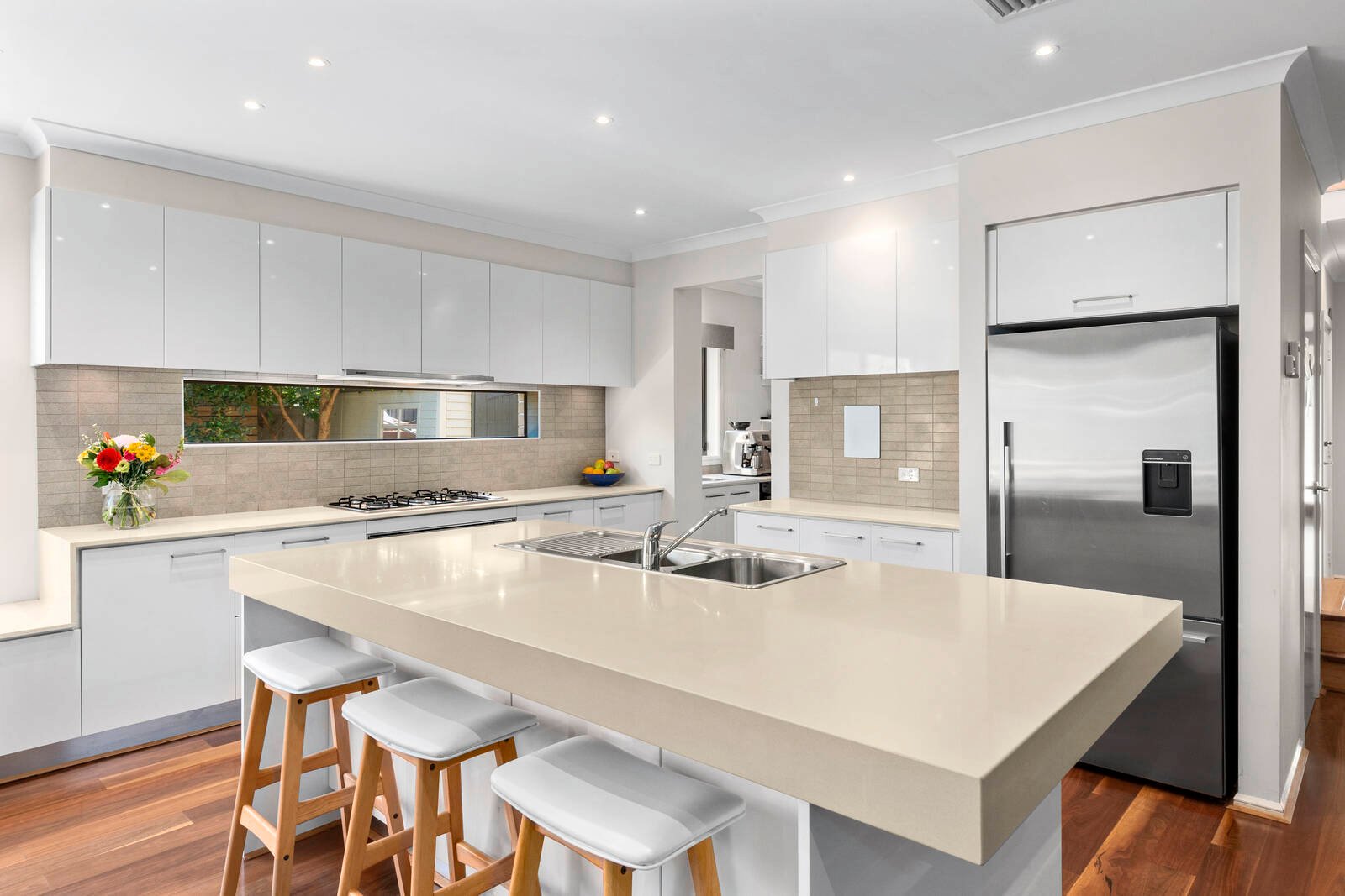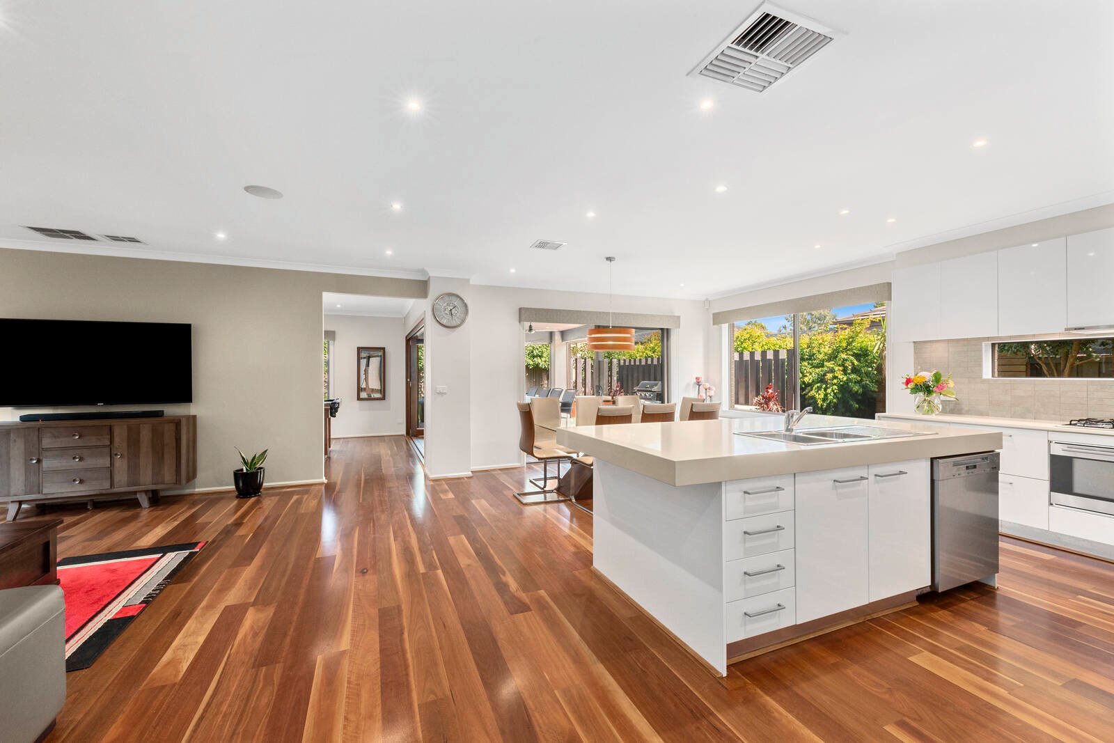 The first of four living areas is positioned off the main entrance, featuring a gas log fire and large north-facing windows bringing in an abundance of natural light, creating a warm and welcoming ambience within. Moving through to the heart of the home, a spacious open plan kitchen, dining and living area is revealed. An elegant kitchen forms the centrepiece with large island bench, stone benchtops, quality Blanco appliances, outstanding storage provisions including full butler’s pantry, and the perfect vantage point to service the dining and alfresco, entertainers will simply love this design.