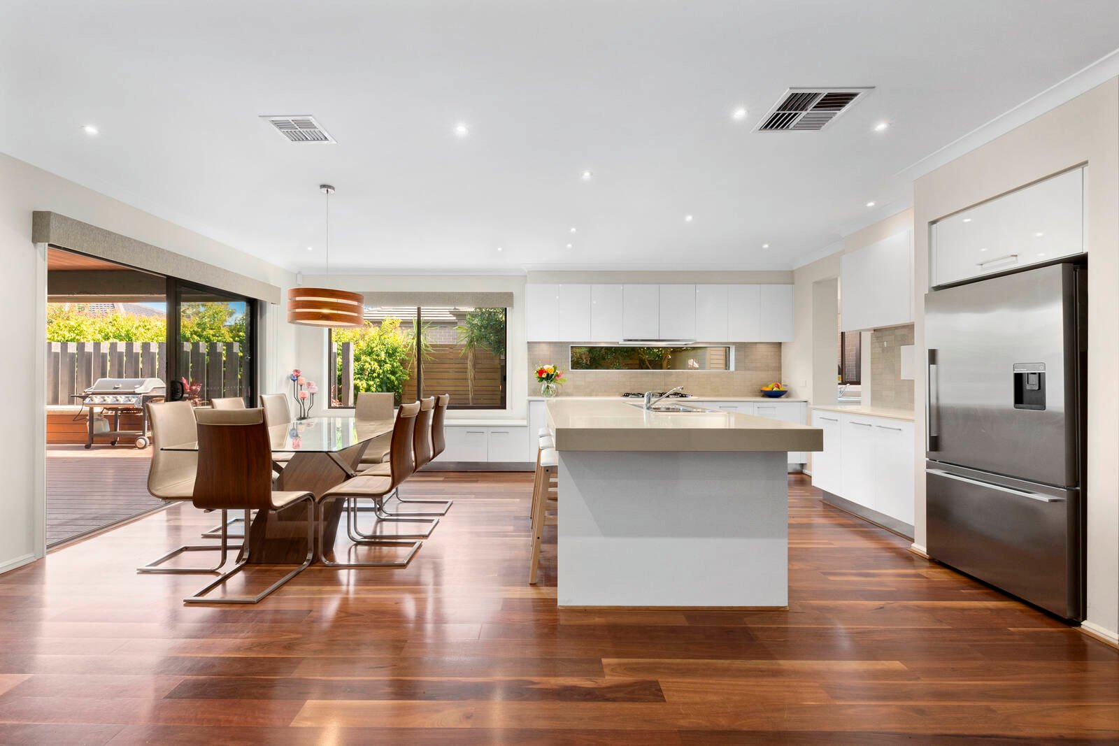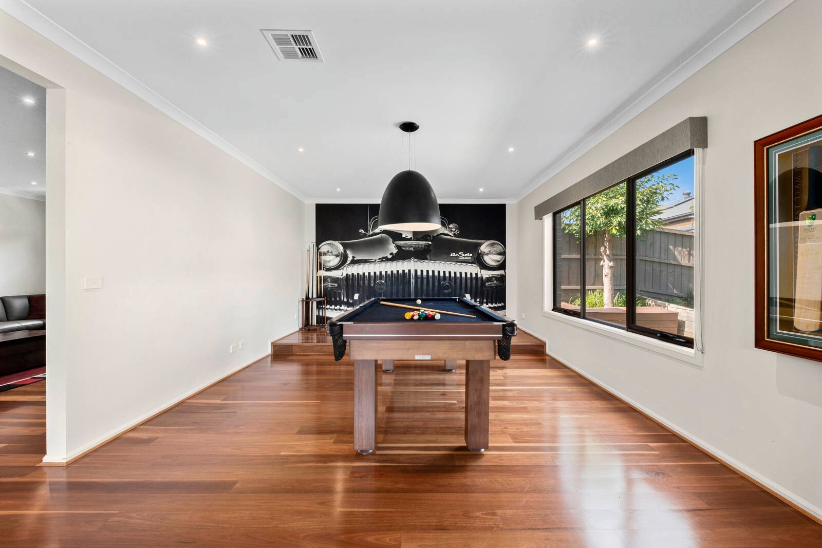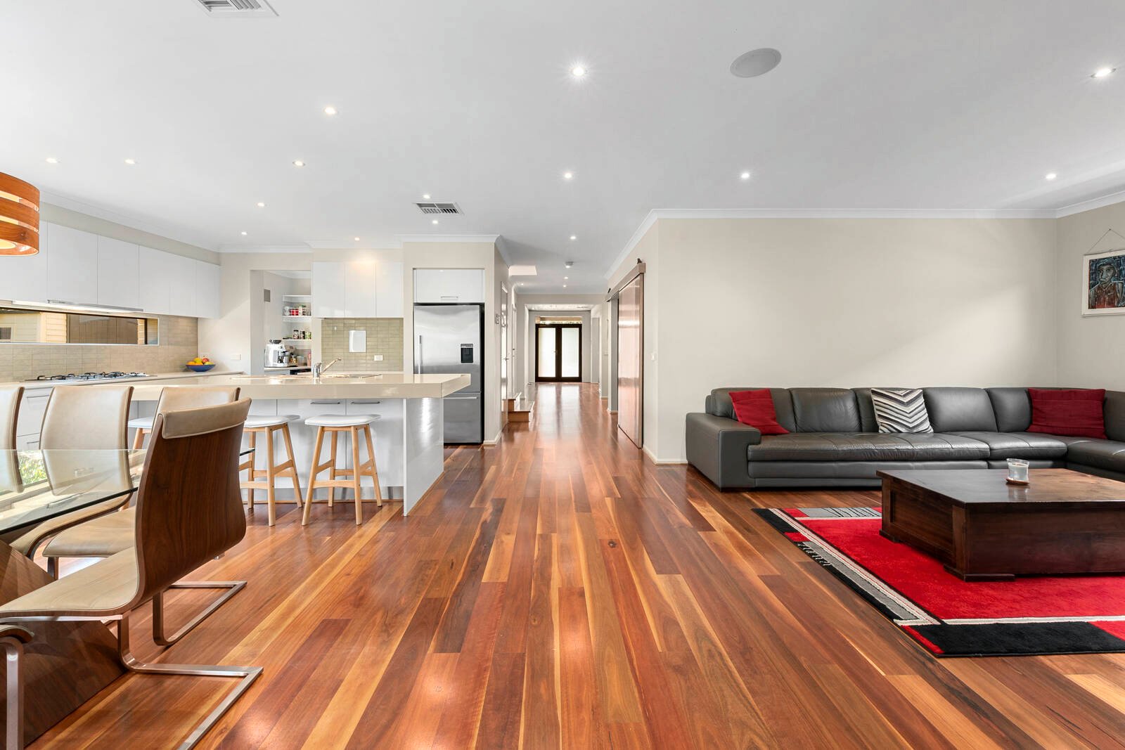 A blend of rendered and stone finishes set behind lush established gardens forms an impressive introduction to the home. Stepping inside, a wide central hallway, rich polished timber flooring, tasteful colour palette and feature timber-lined ceiling creates an amazing wow-factor on entry.